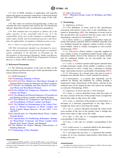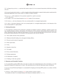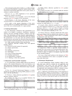 SCOPE 1.1 This specification covers a type of plastic lumber product, defined as polyethylene-based structural-grade plastic lumber (SGPL), for use as main framing members, including joists, stringers, beams, columns; and secondary framing members, including planking, posts and bracing; in outdoor structures such as decks, boardwalks, docks, and platforms. 1.2 This specification is applicable to solid, rectangular SGPL products where polyethylene resin (non cross-linked) is the continuous phase and is at least 50 % of the product (by weight). 1.3 This specification is not applicable to plastic lumber products containing cellulosic materials as additives, fillers or fiber reinforcements. 1.4 SGPL products covered by this specification shall not be used as tensile members. 1.5 SGPL products are produced using several different manufacturing processes. These processes utilize a number of polyethylene resin material systems that include varying proportions of fillers, fiber reinforcements, and other chemical additives. 1.6 Due to thermodynamic effects that result in outer-surface densification during manufacture, SGPL products are typically non-homogeneous in the cross-section. This standard does not address materials that have been modified from their original cross-section. 1.6.1 The cross-section non-homogeneity is addressed in the material property assessments in this document only for applications in which the product cross-section is not modified by cutting, notching, or drilling. For products modified in this manner, additional engineering considerations are required and they are beyond the scope of this document. 1.7 For purposes of this standard, an SGPL product is a specific combination of polyethylene resin, together with fillers, reinforcements, and additives. Each formulation is to be identified as a distinct and different product, to be tested and evaluated separately. 1.8 Diverse and multiple combinations of both virgin and recycled polyethylene material systems are permitted in the manufacture of SGPL products. 1.9 Fiber reinforcements used in SGPL include manufactured materials such as fiberglass (chopped or continuous), carbon, aramid and other polymeric materials. 1.10 A wide variety of chemical additives are typically added to SGPL formulations. Examples include colorants, chemical foaming agents, ultraviolet stabilizers, fire retardants, lubricants, anti-static products, heat stabilizers, and coupling agents. 1.11 Diverse types and combinations of filler systems are permitted in the manufacturing of SGPL products. Fillers that cause the product to fail the requirements of 6.13 are not permitted in the manufacturing of SGPL products. 1.12 In order for a product to be classified as SGPL, it must meet the minimum stress and modulus criteria consistent with the specific product as marked, and additionally the properties specified in Section 6 of this specification. 1.13 This specification pertains to SGPL where any reinforcement is uniformly distributed within the product. When reinforcement is not uniformly distributed, the engineering issues become substantially more complex. For this reason, such products are not covered in this document. 1.14 Products that fail at strains of less than 0.02 (2 %) when tested in flexure in accordance with 6.6 are not compatible with the underlying assumptions of Annex A1 and are beyond the scope of this standard (see Note 1). Note 1: Calculation of time-dependent properties in Annex A1 is based on the assumption that the product does not fail in a brittle manner. The 2 % strain limit was selected based on the judgment of the task group members that created Annex A1. 1.15 This specification addresses issues relevant to a buyer’s requirements for SGPL products and has therefore been developed in the format of a procurement specification. 1.16 Criteria for design are included as part of this specification for SGPL product...