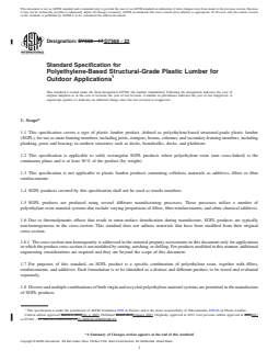 1.1 This specification covers a type of plastic lumber product, defined as polyethylene-based structural-grade plastic lumber (SGPL), for use as main framing members, including joists, stringers, beams, columns; and secondary framing members, including planking, posts and bracing; in outdoor structures such as decks, boardwalks, docks, and platforms.