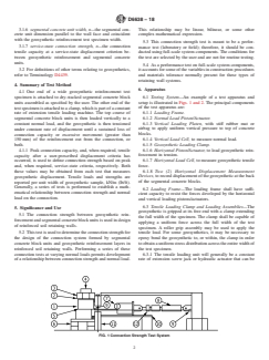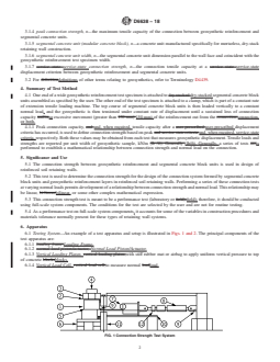 SIGNIFICANCE AND USE 5.1 The connection strength between geosynthetic reinforcement and segmental concrete block units is used in design of reinforced soil retaining walls. 5.2 This test is used to determine the connection strength for the design of the connection system formed by segmental concrete block units and geosynthetic reinforcement layers in reinforced soil retaining walls. Performing a series of these connection tests at varying normal loads permits development of a relationship between connection strength and normal load. This relationship may be linear, bilinear, or some other complex mathematical expression. 5.3 This connection strength test is meant to be a performance test (laboratory or field); therefore, it should be conducted using full-scale system components. The conditions for the test are selected by the user and are not for routine testing. 5.4 As a performance test on full-scale system components, it accounts for some of the variables in construction procedures and materials tolerance normally present for these types of retaining wall systems. SCOPE 1.1 This test method is used to determine the connection properties between a layer of geosynthetic reinforcement and segmental concrete block units used in construction of reinforced soil retaining walls. The test is carried out under conditions determined by the user that reproduce the connection system at full scale. The results of a series of tests are used to define a relationship between connection strength for a segmental unit-geosynthetic connection system and normal load. 1.2 This is a performance test used to determine properties for design of retaining wall systems utilizing segmental concrete units and soil reinforcing geosynthetics, either geotextiles or geogrids. The test is performed on a full-scale construction of the connection and may be run in a laboratory or the field. 1.3 The values stated in SI units are regarded as the standard. The values stated in inch-pound units are provided for information only. 1.4 This standard does not purport to address all of the safety concerns, if any, associated with its use. It is the responsibility of the user of this standard to establish appropriate safety, health, and environmental practices and determine the applicability of regulatory limitations prior to use. 1.5 This international standard was developed in accordance with internationally recognized principles on standardization established in the Decision on Principles for the Development of International Standards, Guides and Recommendations issued by the World Trade Organization Technical Barriers to Trade (TBT) Committee.