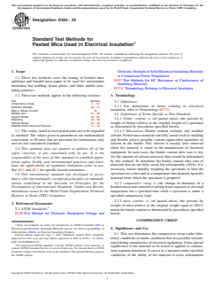 Keywords: pasted mica, electrical insulation, ASTM D352-23, mica paper, mica splittings, compressive creep, dielectric strength, insulation testing, binder content, manufacturing quality control, resistivity, commutator insulation, heater plates, electrical equipment standards.