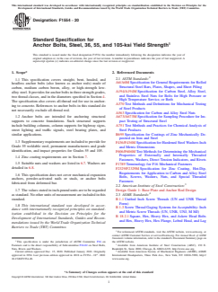 ASTM F1554-20 is a technical specification published by ASTM International. Its full title is "Standard Specification for Anchor Bolts, Steel, 36, 55, and 105-ksi Yield Strength". This standard covers: ABSTRACT This specification covers the chemical, mechanical, and dimensional requirements, and associated test methods for straight and bent, headed and headless anchor bolts (also known as anchor rods) made of carbon, carbon boron, alloy, or high-strength low-alloy steel and having specified yield strengths. The anchor bolts are furnished in three strength grades, two thread classes, and various sizes, and are intended for anchoring structural supports to concrete foundations such as building columns, column supports for highway signs, street lighting and traffic signals, steel bearing plates, and similar applications. This specification, however, does not cover the requirements for mechanical expansion anchors, powder-activated nails or studs, and anchor bolts fabricated from deformed bars. The bolts shall adhere to specified elemental chemical compositions as examined by heat and product analysis. They shall also be tested for their conformance with mechanical properties such as tensile strength, yield strength, elongation, reduction of area, and stress area. The anchor bolts shall also meet specified values for nominal size, body diameter, bend section, length, bend angle, and coated length. SCOPE 1.1 This specification covers straight, bent, headed, and headless anchor bolts (also known as anchor rods) made of carbon, medium carbon boron, alloy, or high-strength low-alloy steel. It provides for anchor bolts in three strength grades, two thread classes, and in the diameters specified in Section 4. The specification also covers all-thread rod for use in anchoring to concrete. References to anchor bolts in this standard do not necessarily exclude all-thread rod. 1.2 Anchor bolts are intended for anchoring structural supports to concrete foundations. Such structural supports include building columns, column supports for highway signs, street lighting and traffic signals, steel bearing plates, and similar applications. 1.3 Supplementary requirements are included to provide for Grade 55 weldable steel, permanent manufacturers and grade identification, and impact properties for Grades 55 and 105. 1.4 Zinc coating requirements are in Section 7. 1.5 Suitable nuts and washers are listed in 6.7. Washers are detailed in 6.8. 1.6 This specification does not cover mechanical expansion anchors, powder-activated nails or studs, or anchor bolts fabricated from deformed bar. 1.7 The values stated in inch-pound units are to be regarded as standard. No other units of measurement are included in this standard. 1.8 This international standard was developed in accordance with internationally recognized principles on standardization established in the Decision on Principles for the Development of International Standards, Guides and Recommendations issued by the World Trade Organization Technical Barriers to Trade (TBT) Committee.