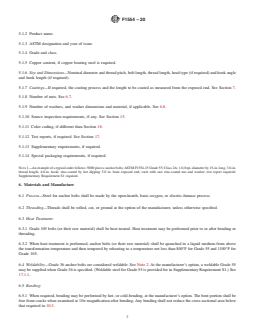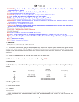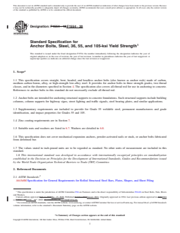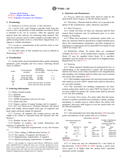ABSTRACT This specification covers the chemical, mechanical, and dimensional requirements, and associated test methods for straight and bent, headed and headless anchor bolts (also known as anchor rods) made of carbon, carbon boron, alloy, or high-strength low-alloy steel and having specified yield strengths. The anchor bolts are furnished in three strength grades, two thread classes, and various sizes, and are intended for anchoring structural supports to concrete foundations such as building columns, column supports for highway signs, street lighting and traffic signals, steel bearing plates, and similar applications. This specification, however, does not cover the requirements for mechanical expansion anchors, powder-activated nails or studs, and anchor bolts fabricated from deformed bars. The bolts shall adhere to specified elemental chemical compositions as examined by heat and product analysis. They shall also be tested for their conformance with mechanical properties such as tensile strength, yield strength, elongation, reduction of area, and stress area. The anchor bolts shall also meet specified values for nominal size, body diameter, bend section, length, bend angle, and coated length. SCOPE 1.1 This specification covers straight, bent, headed, and headless anchor bolts (also known as anchor rods) made of carbon, medium carbon boron, alloy, or high-strength low-alloy steel. It provides for anchor bolts in three strength grades, two thread classes, and in the diameters specified in Section 4. The specification also covers all-thread rod for use in anchoring to concrete. References to anchor bolts in this standard do not necessarily exclude all-thread rod. 1.2 Anchor bolts are intended for anchoring structural supports to concrete foundations. Such structural supports include building columns, column supports for highway signs, street lighting and traffic signals, steel bearing plates, and similar applications. 1.3 Supplementary requirements are included to provide for Grade 55 weldable steel, permanent manufacturers and grade identification, and impact properties for Grades 55 and 105. 1.4 Zinc coating requirements are in Section 7. 1.5 Suitable nuts and washers are listed in 6.7. Washers are detailed in 6.8. 1.6 This specification does not cover mechanical expansion anchors, powder-activated nails or studs, or anchor bolts fabricated from deformed bar. 1.7 The values stated in inch-pound units are to be regarded as standard. No other units of measurement are included in this standard. 1.8 This international standard was developed in accordance with internationally recognized principles on standardization established in the Decision on Principles for the Development of International Standards, Guides and Recommendations issued by the World Trade Organization Technical Barriers to Trade (TBT) Committee.