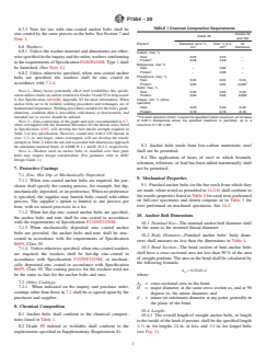 This specification covers the chemical, mechanical, and dimensional requirements, and associated test methods for straight and bent, headed and headless anchor bolts (also known as anchor rods) made of carbon, carbon boron, alloy, or high-strength low-alloy steel and having specified yield strengths. The anchor bolts are furnished in three strength grades, two thread classes, and various sizes, and are intended for anchoring structural supports to concrete foundations such as building columns, column supports for highway signs, street lighting and traffic signals, steel bearing plates, and similar applications. This specification, however, does not cover the requirements for mechanical expansion anchors, powder-activated nails or studs, and anchor bolts fabricated from deformed bars. The bolts shall adhere to specified elemental chemical compositions as examined by heat and product analysis. They shall also be tested for their conformance with mechanical properties such as tensile strength, yield strength, elongation, reduction of area, and stress area. The anchor bolts shall also meet specified values for nominal size, body diameter, bend section, length, bend angle, and coated length.
