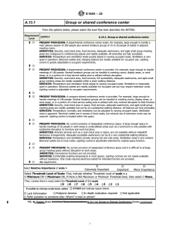 SIGNIFICANCE AND USE 4.1 Each Facility Rating Scale in this classification provides a means for estimating the level of serviceability of a building or facility for one topic of serviceability, and for comparing that level against the level of any other building or facility. 4.2 This classification can be used for comparing how well different buildings or facilities meet a particular requirement for serviceability. It is applicable despite differences such as location, structure, mechanical systems, age, and building shape. 4.3 This classification can be used to estimate the amount of variance of serviceability from target or from requirement, for a single office facility, or within a group of office facilities. 4.4 This classification can be used to estimate the following: (1) serviceability of an existing facility for uses other than its present use; (2) the serviceability (potential) of a facility that has been planned but not yet built; and (3) the serviceability (potential) of a facility for which a remodelling has been planned. 4.5 The use of this classification does not result in building evaluation or diagnosis. Building evaluation or diagnosis generally requires special expertise in building engineering or technology and the use of instruments, tools, or measurements. 4.6 This classification applies only to facilities that are building constructions or parts thereof. (While this classification may be useful in rating the serviceability of facilities that are not building constructions, such facilities are outside the scope of this classification.) 4.7 This classification is not intended for, and is not suitable for, use for regulatory purposes, nor for fire hazard assessment nor for fire risk assessment. SCOPE 1.1 This classification covers pairs of scales for classifying an aspect of the serviceability of an office facility, that is, the capability of an office facility to meet certain possible requirements for special facilities and technologies. 1.2 Each pair of scales, shown in Figs. 1-4, is for classifying one topic of serviceability. Each paragraph in an Occupant Requirement Scale (DEMAND Scale see Figs. 1-4) summarizes one level of requirement for serviceability on which occupants might require. The matching paragraph in the Facility Rating Scale (SUPPLY Scale see Figs. 1-4) is an interpretation of the requirement into a description of certain features of a facility which, taken in combination, indicate that the facility is likely to meet that level of required serviceability. FIG. 1 Demand Scale A.13.1 for Group or Shared Conference Center FIG. 1 Supply Scale A.13.1 for Group or Shared Conference Center (continued) FIG. 2 Demand Scale A.13.2 for Video Conferencing Provision FIG. 2 Supply Scale A.13.2 for Video Conferencing Provision (continued) FIG. 3 Demand Scale A.13.3 for Simultaneous Interpretation FIG. 3 Supply Scale A.13.3 for Simultaneous Interpretation (continued) FIG. 4 Demand Scale A.13.4 for Satellite and Microwave Links FIG. 4 Supply Scale A.13.4 for Satellite and Microwave Links (continued) FIG. 5 Demand and Supply Scales A.13.5 for Telecommunications Center 1.3 The entries in the Facility Rating Scale (See Figs. 1-4) are indicative and not comprehensive. They are for quick scanning, to estimate approximately, quickly, and economically, how well an office facility is likely to meet the needs of one or another type of occupant group over time. The entries are not for measuring, knowing, and evaluating how an office facility is performing. 1.4 This classification can be used to estimate the level of serviceability of an existing facility. It can also be used to estimate the serviceability of a facility that has been planned but not yet built, such as one for which single-line drawings and outline specifications have been prepared. 1.5 This classification indicates what would cause a facility to be rated at a certain level of service...
