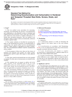 ASTM F2328-17(2022) is a standard published by ASTM International. Its full title is "Standard Test Method for Determining Decarburization and Carburization in Hardened and Tempered Threaded Steel Bolts, Screws, Studs, and Nuts". This standard covers: SIGNIFICANCE AND USE 4.1 Decarburization and carburization are two surface conditions created, either intentionally or unintentionally, as with a pre-existing condition created during the rod rolling process, the rod/wire annealing process, or while heat treating threaded steel products. Too much of either will adversely affect the safety and performance of the threaded product. Therefore, limits have been established for three different product groups: the harder and greater the tensile strength of the product, the more susceptible to failure the product becomes if these limits are exceeded. 4.2 When testing to a particular product specification that lists the dimensions and microindentation data to be used, that data shall take precedence over the tables in this test method. 4.3 There are only two viable methods available to detect these deficiencies, either by the visual method or the microindentation method. Both methods are used for routine inspections when evaluations are conducted at a single location on the product sample. 4.3.1 Because an evaluation at a specific location may not be representative of the whole part, the referee method employs the microindentation method taken as an average of evaluations conducted on four adjacent threads. This procedure significantly reduces the random test variables when compared to testing on a single thread. 4.4 Specifying this test method does not specify or imply that testing shall be for either decarburization or carburization alone or for both conditions. When either test method is performed, both conditions will be apparent and shall be reported. For example, if an order is placed to test for decarburization and none is found, but the presence of carburization is detected, it shall be reported on the test report that carburization was found. SCOPE 1.1 This test method covers procedures for measuring, classifying, and determining the presence of decarburization and carburization in the threaded section of hardened and tempered inch series steel bolts, screws, studs, nuts, and similar parts which have been heated to facilitate fabrication or to modify their mechanical properties. This test method is not intended to address products which are intentionally carburized to achieve specific results. 1.2 Two routine methods are described for measuring the limits of and determining the presence of decarburization or carburization—the optical method and the microindentation method 1. Either method is appropriate for routine examinations. The microindentation method 2 shall be considered the referee method. 1.3 For the purpose of these tests, there are four classes of hardened and tempered steel products for which specific measurements must be made with respect to their physical properties. 1.4 The values stated in inch-pound units are to be regarded as standard. No other units of measurement are included in this standard. 1.5 This standard does not purport to address all of the safety concerns, if any, associated with its use. It is the responsibility of the user of this standard to establish appropriate safety, health, and environmental practices and determine the applicability of regulatory limitations prior to use. 1.6 This international standard was developed in accordance with internationally recognized principles on standardization established in the Decision on Principles for the Development of International Standards, Guides and Recommendations issued by the World Trade Organization Technical Barriers to Trade (TBT) Committee.