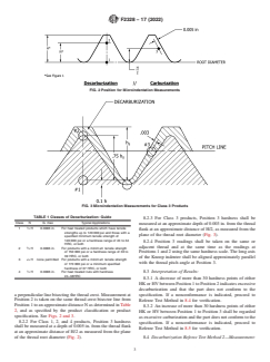 SIGNIFICANCE AND USE 4.1 Decarburization and carburization are two surface conditions created, either intentionally or unintentionally, as with a pre-existing condition created during the rod rolling process, the rod/wire annealing process, or while heat treating threaded steel products. Too much of either will adversely affect the safety and performance of the threaded product. Therefore, limits have been established for three different product groups: the harder and greater the tensile strength of the product, the more susceptible to failure the product becomes if these limits are exceeded. 4.2 When testing to a particular product specification that lists the dimensions and microindentation data to be used, that data shall take precedence over the tables in this test method. 4.3 There are only two viable methods available to detect these deficiencies, either by the visual method or the microindentation method. Both methods are used for routine inspections when evaluations are conducted at a single location on the product sample. 4.3.1 Because an evaluation at a specific location may not be representative of the whole part, the referee method employs the microindentation method taken as an average of evaluations conducted on four adjacent threads. This procedure significantly reduces the random test variables when compared to testing on a single thread. 4.4 Specifying this test method does not specify or imply that testing shall be for either decarburization or carburization alone or for both conditions. When either test method is performed, both conditions will be apparent and shall be reported. For example, if an order is placed to test for decarburization and none is found, but the presence of carburization is detected, it shall be reported on the test report that carburization was found. SCOPE 1.1 This test method covers procedures for measuring, classifying, and determining the presence of decarburization and carburization in the threaded section of hardened and tempered inch series steel bolts, screws, studs, nuts, and similar parts which have been heated to facilitate fabrication or to modify their mechanical properties. This test method is not intended to address products which are intentionally carburized to achieve specific results. 1.2 Two routine methods are described for measuring the limits of and determining the presence of decarburization or carburization—the optical method and the microindentation method 1. Either method is appropriate for routine examinations. The microindentation method 2 shall be considered the referee method. 1.3 For the purpose of these tests, there are four classes of hardened and tempered steel products for which specific measurements must be made with respect to their physical properties. 1.4 The values stated in inch-pound units are to be regarded as standard. No other units of measurement are included in this standard. 1.5 This standard does not purport to address all of the safety concerns, if any, associated with its use. It is the responsibility of the user of this standard to establish appropriate safety, health, and environmental practices and determine the applicability of regulatory limitations prior to use. 1.6 This international standard was developed in accordance with internationally recognized principles on standardization established in the Decision on Principles for the Development of International Standards, Guides and Recommendations issued by the World Trade Organization Technical Barriers to Trade (TBT) Committee.