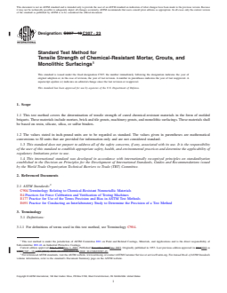 ASTM C307-23 is a standard published by ASTM International. Its full title is "Standard Test Method for Tensile Strength of Chemical-Resistant Mortar, Grouts, and Monolithic Surfacings". This standard covers: SIGNIFICANCE AND USE 4.1 It is recognized that chemical-resistant mortars, grouts, and monolithic surfacings are not usually under tension when in service; however, such data are useful for purposes of determining the rate of cure and other properties. 4.2 This test method is not recommended for mortars, grouts, and monolithic surfacings containing aggregate greater than 1/4 in. SCOPE 1.1 This test method covers the determination of tensile strength of cured chemical-resistant materials in the form of molded briquets. These materials include mortars, brick and tile grouts, machinery grouts, and monolithic surfacings. These materials shall be based on resin, silicate, silica, or sulfur binders. 1.2 The values stated in inch-pound units are to be regarded as standard. The values given in parentheses are mathematical conversions to SI units that are provided for information only and are not considered standard. 1.3 This standard does not purport to address all of the safety concerns, if any, associated with its use. It is the responsibility of the user of this standard to establish appropriate safety, health, and environmental practices and determine the applicability of regulatory limitations prior to use. 1.4 This international standard was developed in accordance with internationally recognized principles on standardization established in the Decision on Principles for the Development of International Standards, Guides and Recommendations issued by the World Trade Organization Technical Barriers to Trade (TBT) Committee.