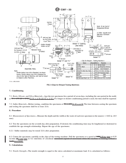 SIGNIFICANCE AND USE 4.1 It is recognized that chemical-resistant mortars, grouts, and monolithic surfacings are not usually under tension when in service; however, such data are useful for purposes of determining the rate of cure and other properties. 4.2 This test method is not recommended for mortars, grouts, and monolithic surfacings containing aggregate greater than 1/4 in. SCOPE 1.1 This test method covers the determination of tensile strength of cured chemical-resistant materials in the form of molded briquets. These materials include mortars, brick and tile grouts, machinery grouts, and monolithic surfacings. These materials shall be based on resin, silicate, silica, or sulfur binders. 1.2 The values stated in inch-pound units are to be regarded as standard. The values given in parentheses are mathematical conversions to SI units that are provided for information only and are not considered standard. 1.3 This standard does not purport to address all of the safety concerns, if any, associated with its use. It is the responsibility of the user of this standard to establish appropriate safety, health, and environmental practices and determine the applicability of regulatory limitations prior to use. 1.4 This international standard was developed in accordance with internationally recognized principles on standardization established in the Decision on Principles for the Development of International Standards, Guides and Recommendations issued by the World Trade Organization Technical Barriers to Trade (TBT) Committee.