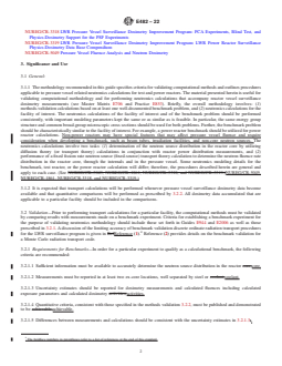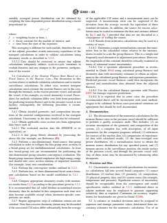 SIGNIFICANCE AND USE 3.1 General: 3.1.1 The methodology recommended in this guide specifies criteria for validating computational methods and outlines procedures applicable to pressure vessel related neutronics calculations for test and power reactors. The material presented herein is useful for validating computational methodology and for performing neutronics calculations that accompany reactor vessel surveillance dosimetry measurements (see Master Matrix E706 and Practice E853). Briefly, the overall methodology involves: (1) methods-validation calculations based on at least one well-documented benchmark problem, and (2) neutronics calculations for the facility of interest. The neutronics calculations of the facility of interest and of the benchmark problem should be performed consistently, with important modeling parameters kept the same or as similar as is feasible. In particular, the same energy group structure and common broad-group microscopic cross sections should be used for both problems. Further, the benchmark problem should be characteristically similar to the facility of interest. For example, a power reactor benchmark should be utilized for power reactor calculations. Non-power reactors may have special features that may affect pressure vessel fluence and require consideration when developing a benchmark, such as beam tubes, irradiation facilities, and non-core neutron sources. The neutronics calculations involve two tasks: (1) determination of the neutron source distribution in the reactor core by utilizing diffusion theory (or transport theory) calculations in conjunction with reactor power distribution measurements, and (2) performance of a fixed fission rate neutron source (fixed-source) transport theory calculation to determine the neutron fluence rate distribution in the reactor core, through the internals and in the pressure vessel. Some neutronics modeling details for the benchmark, test reactor, or the power reactor calculation will differ; therefore, the proc... SCOPE 1.1 Need for Neutronics Calculations—An accurate calculation of the neutron fluence and fluence rate at several locations is essential for the analysis of integral dosimetry measurements and for predicting irradiation damage exposure parameter values in the pressure vessel. Exposure parameter values may be obtained directly from calculations or indirectly from calculations that are adjusted with dosimetry measurements; Guide E944 and Practice E853 define appropriate computational procedures. 1.2 Methodology—Neutronics calculations for application to reactor vessel surveillance encompass three essential areas: (1) validation of methods by comparison of calculations with dosimetry measurements in a benchmark experiment, (2) determination of the neutron source distribution in the reactor core, and (3) calculation of neutron fluence rate at the surveillance position and in the pressure vessel. 1.3 This standard does not purport to address all of the safety concerns, if any, associated with its use. It is the responsibility of the user of this standard to establish appropriate safety, health, and environmental practices and determine the applicability of regulatory limitations prior to use. 1.4 This international standard was developed in accordance with internationally recognized principles on standardization established in the Decision on Principles for the Development of International Standards, Guides and Recommendations issued by the World Trade Organization Technical Barriers to Trade (TBT) Committee.