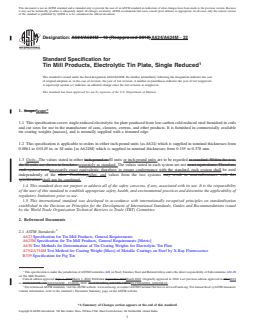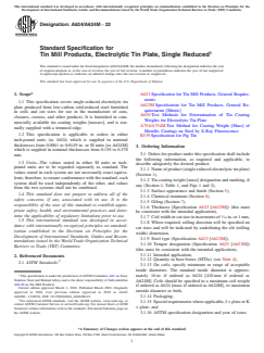 - Product Scope: Covers single-reduced electrolytic tin plate, supplied in coils and cut sizes, with defined thickness ranges for both inch-pound (0.0061 - 0.0149 inches) and SI (0.155 - 0.378 mm) units.