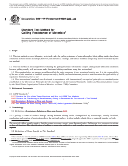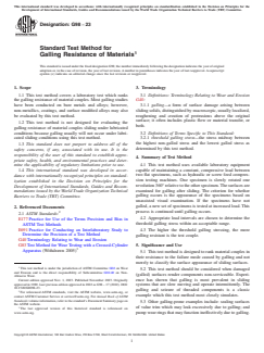 1.1 This test method covers a laboratory test which ranks the galling resistance of material couples. Most galling studies have been conducted on bare metals and alloys; however, non-metallics, coatings, and surface modified alloys may also be evaluated by this test method.