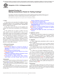ASTM D1734-93(2022) is a standard published by ASTM International. Its full title is "Standard Practice for Making Cementitious Panels for Testing Coatings". This standard covers: SIGNIFICANCE AND USE 3.1 Researchers in the field of coatings have recognized the need for a standardized substrate for evaluating coatings intended for use on cementitious surfaces. This practice describes the preparation of such panels. SCOPE 1.1 This practice covers procedures for molding and curing cementitious panels for use in exposure testing of coatings designed for masonry or cementitious surfaces, although these may be suitable for other tests. 1.2 The values stated in SI units are to be regarded as the standard. The values given in parentheses are for information only. 1.3 This standard does not purport to address all of the safety concerns, if any, associated with its use. It is the responsibility of the user of this standard to establish appropriate safety, health, and environmental practices and determine the applicability of regulatory limitations prior to use. 1.4 This international standard was developed in accordance with internationally recognized principles on standardization established in the Decision on Principles for the Development of International Standards, Guides and Recommendations issued by the World Trade Organization Technical Barriers to Trade (TBT) Committee.