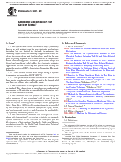ASTM B32-20 is a technical specification published by ASTM International. Its full title is "Standard Specification for Solder Metal". This standard covers: ABSTRACT This specification covers solder metal alloys (also known as soft solders) used in non-electronic applications, including but not limited to, tin-lead, tin-antimony, tin-antimony-copper-silver, tin-antimony-copper-silver-nickel, tin-silver, tin-copper-silver, and lead-tin-silver, used for the purpose of joining together two or more metals at temperatures below their melting points. Included here are solders in the form of solid bars, ingots, powder and special forms, and in the form of solid and flux-core ribbons, wires, and solder pastes. Electronic grade solder alloys and fluxed and non-fluxed solid solders for electronic soldering applications are not taken into account here. Solder alloys shall adhere to chemical composition requirements specified for the following flux types: Types R, RMA, and RA, which are composed of Grade WW or WG gum rosin; Type OA, which is composed of water-soluble organic materials; Type OS, which is composed of water-insoluble organic materials; and Type IS, which is composed of inorganic saltsor acids. Solders shall also meet physical property requirements such as paste texture, powder mesh size, viscosity, solder pool, and dryness, and pass performance requirements such as chlorides and bromides test, copper mirror test, and visual inspection. Other properties to which the alloys should conform to are dimensions and unit weights, spread factor, and resistivity of water extract. SCOPE 1.1 This specification covers solder metal alloys (commonly known as soft solders) used in non-electronic applications, including but not limited to, tin-lead, tin-antimony, tin-antimony-copper-silver, tin-antimony-copper-silver-nickel, tin-silver, tin-copper-silver, and lead-tin-silver, used for the purpose of joining together two or more metals at temperatures below their melting points. Electronic grade solder alloys and fluxed and non-fluxed solid solders for electronic soldering applications are not covered by this specification as they are under the auspices of IPC – Association Connecting Electronic Industries. 1.1.1 These solders include those alloys having a liquidus temperature not exceeding 800°F (430°C). 1.1.2 This specification includes solders in the form of solid bars, ingots, powder and special forms, and in the form of solid and flux-core ribbon, wire, and solder paste. 1.2 The values stated in inch-pound units are to be regarded as standard. The values given in parentheses are mathematical conversions to SI units that are provided for information only and are not considered standard. 1.3 This standard does not purport to address all of the safety concerns, if any, associated with its use. It is the responsibility of the user of this standard to become familiar with all hazards including those identified in the appropriate Safety Data Sheet (SDS) for this product/material as provided by the manufacturer, to establish appropriate safety, health, and environmental practices, and determine the applicability of regulatory limitations prior to use. 1.4 This international standard was developed in accordance with internationally recognized principles on standardization established in the Decision on Principles for the Development of International Standards, Guides and Recommendations issued by the World Trade Organization Technical Barriers to Trade (TBT) Committee.