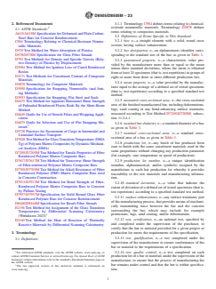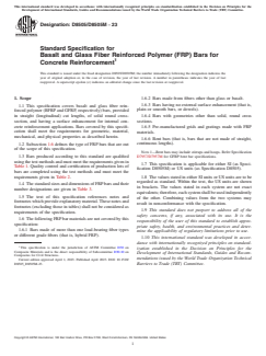 ASTM D8505/D8505M-23 is a technical specification published by ASTM International. Its full title is "Standard Specification for Basalt and Glass Fiber Reinforced Polymer (FRP) Bars for Concrete Reinforcement". This standard covers: SCOPE 1.1 This specification covers basalt and glass fiber reinforced polymer (BFRP and GFRP, respectively) bars, provided in straight (longitudinal) cut lengths, of solid round cross-section, and having a surface enhancement for internal concrete reinforcement applications. Bars covered by this specification shall meet the requirements for geometric, material, mechanical, and physical properties as described herein. 1.2 Subsection 1.6 defines the type of FRP bars that are out of the scope of this specification. 1.3 Bars produced according to this standard are qualified using the test methods and must meet the requirements given in Table 1. Quality control and certification of production lots of bars are completed using the test methods and must meet the requirements given in Table 2. 1.4 The standard sizes and dimensions of FRP bars and their number designations are given in Table 3. 1.5 The text of this specification references notes and footnotes which provide explanatory material. These notes and footnotes (excluding those in tables) shall not be considered as requirements of the specification. 1.6 The following FRP bar materials are not covered by this specification: 1.6.1 Bars made of more than one load-bearing fiber types or different grade fibers (that is, hybrid FRP). 1.6.2 Bars made from fibers other than glass or basalt. 1.6.3 Bars having no external surface enhancement (that is, plain or smooth bars, or dowels). 1.6.4 Bars with geometries other than solid, round cross sections. 1.6.5 Pre-manufactured grids and gratings made with FRP materials. 1.6.6 Bent bars (that is, bars that are not made of straight, continuous lengths). Note 1: Bent bars may include stirrups and hoops. Refer Specification D7957/D7957M for GFRP bent bar specifications. 1.7 This specification is applicable for either SI (as Specification D8505M) or US units (as Specification D8505). 1.8 The values stated in either SI units or US units are to be regarded as standard. Within the text, the US units are shown in brackets. The values stated in each system are not exact equivalents; therefore, each system shall be used independently of the other. Combining values from the two systems may result in nonconformance with the specification. 1.9 This standard does not purport to address all of the safety concerns, if any, associated with its use. It is the responsibility of the user of this standard to establish appropriate safety, health, and environmental practices and determine the applicability of regulatory limitations prior to use. 1.10 This international standard was developed in accordance with internationally recognized principles on standardization established in the Decision on Principles for the Development of International Standards, Guides and Recommendations issued by the World Trade Organization Technical Barriers to Trade (TBT) Committee.