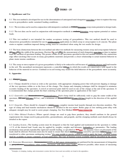 5.4 The creep or stress rupture of a given geosynthetic is likely to be reduced in soil because of confining stresses and load transfer to the soil. The unconfined environment represents a controlled test in which the results are conservative with regard to the behavior of the material in service. Confined or in-soil testing may model the field behavior of the geosynthetic more accurately.