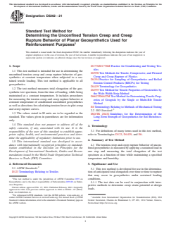 SIGNIFICANCE AND USE 5.1 This test method is developed for use in the determination of anticipated total elongation over time or time to rupture that may occur in geosynthetics under sustained loading conditions. 5.1.1 The test data can be used in conjunction with interpretive methods to determine creep strain potential at design loads. 5.1.2 The test data can be used in conjunction with interpretive methods to determine creep rupture potential at various loads. 5.2 This test method is not intended for routine acceptance testing of geosynthetics. This test method should be used to characterize geosynthetics intended for use in reinforcement applications in which creep or creep rupture is of concern. The plane strain or rupture condition imposed during testing must be considered when using the test results for design. 5.3 The basic distinctions between this test method and other test methods for measuring tension creep and creep rupture behavior are: (1) the width of the specimens (Section 8), and (2) the measurement of total elongation over time or time to rupture from the moment of specimen loading. The greater widths of the specimens specified in this test method minimize the contraction edge effect (necking) that occurs in many geosynthetic materials and provides a closer relationship to actual material behavior in plane strain tension conditions. 5.4 The creep or stress rupture of a given geosynthetic is likely to be reduced in soil because of confining stresses and load transfer to the soil. The unconfined environment represents a controlled test in which the results are conservative with regard to the behavior of the material in service. Confined or in-soil testing may model the field behavior of the geosynthetic more accurately. SCOPE 1.1 This test method is intended for use in determining the unconfined tension creep and creep rupture behavior of geosynthetics at constant temperature when subjected to a sustained tensile loading. This test method is applicable to all geosynthetics. 1.2 The test method measures total elongation of the geosynthetic test specimen, from the time of loading, while being maintained at a constant temperature. It includes procedures for measuring the tension creep and creep rupture behavior at constant temperature of conditioned unconfined geosynthetics as well as directions for calculating tension forces to plot creep and creep rupture curves. 1.3 The values stated in SI units are to be regarded as the standard. The values given in parentheses are for information only. 1.4 This standard does not purport to address all of the safety concerns, if any, associated with its use. It is the responsibility of the user of this standard to establish appropriate safety, health, and environmental practices and determine the applicability of regulatory limitations prior to use. 1.5 This international standard was developed in accordance with internationally recognized principles on standardization established in the Decision on Principles for the Development of International Standards, Guides and Recommendations issued by the World Trade Organization Technical Barriers to Trade (TBT) Committee.