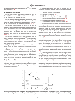 SIGNIFICANCE AND USE 5.1 This test method is useful for determining the plutonium content of items such as impure Pu oxide, mixed Pu/U oxide, oxidized Pu metal, Pu scrap and waste, Pu process residues, and weapons components. 5.2 Measurements made with this test method may be suitable for safeguards or waste characterization requirements such as: 5.2.1 Nuclear materials accountability, 5.2.2 Inventory verification (7), 5.2.3 Confirmation of nuclear materials content (8), 5.2.4 Resolution of shipper/receiver differences (9), 5.2.5 Excess weapons materials inspections (10, 11), 5.2.6 Safeguards termination on waste (12, 13), 5.2.7 Determination of fissile equivalent content (14). 5.3 A significant feature of neutron multiplicity counting is its ability to capture more information than neutron coincidence counting because of the availability of a third measured parameter, leading to reduced measurement bias for most material categories for which suitable precision can be attained. This feature also makes it possible to assay some in-plant materials that are not amenable to conventional coincidence counting, including moist or impure plutonium oxide, oxidized metal, and some categories of scrap, waste, and residues (10). 5.4 Calibration for many material types does not require representative standards. Thus, the technique can be used for inventory verification without calibration standards (7), although measurement bias may be lower if representative standards were available. 5.4.1 The repeatability of the measurement results due to counting statistics is related to the quantity of nuclear material, interfering neutrons, and the count time of the measurement (15) . 5.4.2 For certain materials such as small Pu, items of less than 1 g, some Pu-bearing waste, or very impure Pu process residues where the (α,n) reaction rate overwhelms the triples signal, multiplicity information may not be useful because of the poor counting statistics of the triple coinci... SCOPE 1.1 This test method describes the nondestructive assay of plutonium in forms such as metal, oxide, scrap, residue, or waste using passive neutron multiplicity counting. This test method provides results that are usually more accurate than conventional neutron coincidence counting. The method can be applied to a large variety of plutonium items in various containers including cans, 208-L drums, or 1900-L Standard Waste Boxes. It has been used to assay items whose plutonium content ranges from 1 g to 1000s of g. 1.2 There are several electronics or mathematical approaches available for multiplicity analysis, including the multiplicity shift register, the Euratom Time Correlation Analyzer, and the List Mode Module, as described briefly in Ref. (1).2 1.3 This test method is primarily intended to address the assay of 240Pu-effective by moments-based multiplicity analysis using shift register electronics (1, 2, 3) and high efficiency neutron counters specifically designed for multiplicity analysis. 1.4 This test method requires knowledge of the relative abundances of the plutonium isotopes to determine the total plutonium mass (See Test Method C1030). 1.5 This test method may also be applied to modified neutron coincidence counters (4) which were not specifically designed as multiplicity counters (that is, HLNCC, AWCC, etc), with a corresponding degradation of results. 1.6 The values stated in SI units are to be regarded as standard. No other units of measurement are included in this standard. 1.7 This standard does not purport to address all of the safety concerns, if any, associated with its use. It is the responsibility of the user of this standard to establish appropriate safety and health practices and determine the applicability of regulatory limitations prior to use.