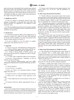 SIGNIFICANCE AND USE 5.1 This test method is specifically directed at the spray painting of automobile car and light duty truck bodies. The general principles are applicable to the painting of other automotive parts. 5.2 This test method may also be used to measure transfer efficiency in full-sized painting facilities simulating production conditions and operations. SCOPE 1.1 This test method covers procedures for determination of the transfer efficiency (using a weight method) under production conditions for in-plant spray application of automotive paints as outlined in Section 18 of EPA 450/3-88-018. 1.2 The transfer efficiency is calculated from the weight of the paint solids sprayed and that deposited on the painted part. The recommended approach involves painting the part directly. Also described is an alternative approach for painting parts covered with aluminum foil. 1.3 The values stated in SI units are to be regarded as the standard. The values given in parentheses are for information only. 1.4 This standard does not purport to address all of the safety concerns, if any, associated with its use. It is the responsibility of the user of this standard to establish appropriate safety, health, and environmental practices and determine the applicability of regulatory limitations prior to use. Specific hazard statements are given in 10.1.8.1. 1.5 This international standard was developed in accordance with internationally recognized principles on standardization established in the Decision on Principles for the Development of International Standards, Guides and Recommendations issued by the World Trade Organization Technical Barriers to Trade (TBT) Committee.
