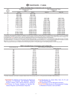 ASTM F2437/F2437M-17(2023) is a technical specification published by ASTM International. Its full title is "Standard Specification for Carbon and Alloy Steel Compressible-Washer-Type Direct Tension Indicators for Use with Cap Screws, Bolts, Anchors, and Studs". This standard covers: ABSTRACT This specification covers the requirements for carbon and alloy steel compressible-washer-type direct tension indicators (DTIs) capable of indicating a specified bolt tension in cap screws, bolts, anchors, and studs. These DTIs are intended for installation under a bolt or cap screw head, a hex nut, or against a hardened washer or other flat hardened surface. The following are two types of DTIs: Type 1 DTIs are suitable for comparatively large bearing surfaces and Type 2 DTIs are suitable for comparatively smaller bearing surfaces. DTIs shall have a configuration produced by extrusion, punching, pressing, or similar forming to permit a measurable decrease in thickness when placed in compression. The design shall be such that the degree of plastic deformation of the protrusions shall indicate the tension in a tightened cap screw, bolt, anchor, or stud. The process used for heat treatment of DTIs, if required, shall be through-hardening by heating to a temperature above the upper transformation temperature, quenching in oil, and then tempering by reheating to a suitable temperature to attain desired mechanical/performance properties. Protective coatings, platings, or finishes may be applied on the DTIs if specified. Compression load and hardness of the DTIs shall be determined by performing mechanical tests. SCOPE 1.1 This specification covers the requirements for carbon and alloy steel compressible-washer-type direct tension indicators (DTIs) capable of indicating a specified bolt tension in cap screws, bolts, anchors, and studs. 1.2 Direct tension indicators in inch sizes 1/4 through 21/2 in. and metric sizes M6 and M72 are covered. 1.3 Direct tension indicators have two styles and four grades for inch fasteners, Grades 5, 8, 55, and 105, and two property classes for metric fasteners, property classes 8.8 and 10.9 each of which differ in their compressive load requirements at a given gap (see Table 1 and Table 2). 1.3.1 Style 1 DTIs are suitable for comparatively smaller bearing surfaces. Style 1 DTIs are available in Grades 5 and 8, which differ in the amount of tension they indicate at a prescribed gap (see Table 1 and Table 3). 1.3.2 Style 2 DTIs are suitable for comparatively large bearing surfaces. Style 2 DTIs are available in Grades 55 and 105, which differ in the amount of tension they indicate at a prescribed gap (see Table 1 and Table 3). 1.4 Direct tension indicators are intended for installation under a bolt or cap screw head, a hex nut, or against a hardened washer or other flat hardened surface. 1.5 Recommended Fasteners—Fasteners meeting the requirements of the standards referenced in Table 3 are considered compatible with the DTI grade or class listed. 1.6 The values stated for Inch DTIs are expressed in inch-pound units and for Metric DTIs values are expressed in SI units. The values stated in either SI units or inch-pound units are to be regarded separately as standard. The values stated in each system are not necessarily exact equivalents; therefore, to ensure conformance with the standard, each system shall be used independently of the other, and values from the two systems shall not be combined. 1.7 The following precautionary statement pertains only to the test method portions, Section 12of this specification: This standard does not purport to address all of the safety concerns, if any, associated with its use. It is the responsibility of the user of this standard to establish appropriate safety, health, and environmental practices and determine the applicability of regulatory limitations prior to use. 1.8 This international standard was developed in accordance with internationally recognized principles on standardization established in the Decision on Principles for the Development of International Standards, Guides and Recommendations issued by the World Trade Organization Technical Barriers to Trade (TBT) Committee.