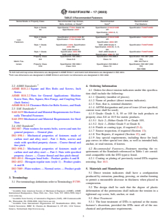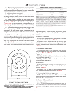 ABSTRACT This specification covers the requirements for carbon and alloy steel compressible-washer-type direct tension indicators (DTIs) capable of indicating a specified bolt tension in cap screws, bolts, anchors, and studs. These DTIs are intended for installation under a bolt or cap screw head, a hex nut, or against a hardened washer or other flat hardened surface. The following are two types of DTIs: Type 1 DTIs are suitable for comparatively large bearing surfaces and Type 2 DTIs are suitable for comparatively smaller bearing surfaces. DTIs shall have a configuration produced by extrusion, punching, pressing, or similar forming to permit a measurable decrease in thickness when placed in compression. The design shall be such that the degree of plastic deformation of the protrusions shall indicate the tension in a tightened cap screw, bolt, anchor, or stud. The process used for heat treatment of DTIs, if required, shall be through-hardening by heating to a temperature above the upper transformation temperature, quenching in oil, and then tempering by reheating to a suitable temperature to attain desired mechanical/performance properties. Protective coatings, platings, or finishes may be applied on the DTIs if specified. Compression load and hardness of the DTIs shall be determined by performing mechanical tests. SCOPE 1.1 This specification covers the requirements for carbon and alloy steel compressible-washer-type direct tension indicators (DTIs) capable of indicating a specified bolt tension in cap screws, bolts, anchors, and studs. 1.2 Direct tension indicators in inch sizes 1/4 through 21/2 in. and metric sizes M6 and M72 are covered. 1.3 Direct tension indicators have two styles and four grades for inch fasteners, Grades 5, 8, 55, and 105, and two property classes for metric fasteners, property classes 8.8 and 10.9 each of which differ in their compressive load requirements at a given gap (see Table 1 and Table 2). 1.3.1 Style 1 DTIs are suitable for comparatively smaller bearing surfaces. Style 1 DTIs are available in Grades 5 and 8, which differ in the amount of tension they indicate at a prescribed gap (see Table 1 and Table 3). 1.3.2 Style 2 DTIs are suitable for comparatively large bearing surfaces. Style 2 DTIs are available in Grades 55 and 105, which differ in the amount of tension they indicate at a prescribed gap (see Table 1 and Table 3). 1.4 Direct tension indicators are intended for installation under a bolt or cap screw head, a hex nut, or against a hardened washer or other flat hardened surface. 1.5 Recommended Fasteners—Fasteners meeting the requirements of the standards referenced in Table 3 are considered compatible with the DTI grade or class listed. 1.6 The values stated for Inch DTIs are expressed in inch-pound units and for Metric DTIs values are expressed in SI units. The values stated in either SI units or inch-pound units are to be regarded separately as standard. The values stated in each system are not necessarily exact equivalents; therefore, to ensure conformance with the standard, each system shall be used independently of the other, and values from the two systems shall not be combined. 1.7 The following precautionary statement pertains only to the test method portions, Section 12of this specification: This standard does not purport to address all of the safety concerns, if any, associated with its use. It is the responsibility of the user of this standard to establish appropriate safety, health, and environmental practices and determine the applicability of regulatory limitations prior to use. 1.8 This international standard was developed in accordance with internationally recognized principles on standardization established in the Decision on Principles for the Development of International Standards, Guides and Recommendations issued by the World Trade Organization Technical Barriers to Trade (TBT) Committee.
