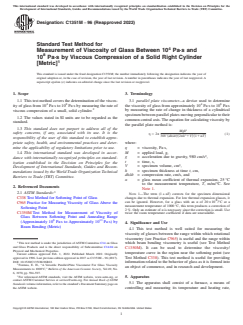 SIGNIFICANCE AND USE 4.1 This test method is well suited for measuring the viscosity of glasses between the range within which rotational viscometry (see Practice C965) is useful and the range within which beam bending viscometry is useful (see Test Method C1350M). It can be used to determine the viscosity/temperature curve in the region near the softening point (see Test Method C338). This test method is useful for providing information related to the behavior of glass as it is formed into an object of commerce, and in research and development. SCOPE 1.1 This test method covers the determination of the viscosity of glass from 104 Pa·s to 108 Pa·s by measuring the rate of viscous compression of a small, solid cylinder.2 1.2 The values stated in SI units are to be regarded as the standard. 1.3 This standard does not purport to address all of the safety concerns, if any, associated with its use. It is the responsibility of the user of this standard to establish appropriate safety, health, and environmental practices and determine the applicability of regulatory limitations prior to use. 1.4 This international standard was developed in accordance with internationally recognized principles on standardization established in the Decision on Principles for the Development of International Standards, Guides and Recommendations issued by the World Trade Organization Technical Barriers to Trade (TBT) Committee.