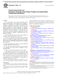 ASTM D4551-22 is a technical specification published by ASTM International. Its full title is "Standard Specification for Poly(Vinyl Chloride) (PVC) Plastic Flexible Concealed Water-Containment Membrane". This standard covers: ABSTRACT This specification covers poly(vinyl chloride) flexible sheeting which is used without mastic, bedding, or coating for construction of concealed water containment membranes that include fountains, pools, planters, shower and safe pans, tile tubs, or similar wet installations where the membrane is inaccessible once the construction is complete. The plastic materials shall meet the inherent viscosity and compound density requirements and shall be subjected to tests that have been selected to be conducted primarily with liquids that simulate the environment to which the membrane will be subjected during actual use. Qualification tests shall be performed wherein the sheeting shall conform to the following physical property requirements: thickness; stress-strain properties such as tensile strength, tensile stress at elongation, and elongation at break; tear resistance; pinholes; microorganism resistance; puncture resistance; indentation resistance; folding resistance; chemical resistance to distilled water, soapy water, or alkali; hydrostatic pressure resistance; shrinkage; and volatile loss. SCOPE 1.1 This specification covers poly(vinyl chloride) (PVC) flexible sheeting which is used without mastic, bedding, or coating for construction of concealed water-containment-membranes in applications where there is potential for costly secondary damage from water leakage and very long-term reliable performance is essential. Examples are fountains, pools, planters, shower and safe pans, tile tubs, or similar wet installations where the membrane is inaccessible once the construction is complete. Included are requirements for materials and sheeting, test methods, workmanship criteria, and methods of marking. 1.2 Recycled materials may be used in this product in accordance with the requirements in Section 5. 1.3 The tests are intended to ensure quality and performance and are not intended for design purposes. Tests have been selected to be conducted primarily with liquids that simulate the environment to which the membrane will be subjected during actual use. 1.4 This specification does not cover water-containment membranes exposed to ultraviolet light. 1.5 The values stated in inch-pound units are to be regarded as the standard. The values given in parentheses are for information only. 1.6 There is no known ISO equivalent to this standard. 1.7 The following precautionary caveat pertains only to the test method portion, Section 11, of this specification: This standard does not purport to address all of the safety concerns, if any, associated with its use. It is the responsibility of the user of this standard to establish appropriate safety, health, and environmental practices and determine the applicability of regulatory limitations prior to use. 1.8 This international standard was developed in accordance with internationally recognized principles on standardization established in the Decision on Principles for the Development of International Standards, Guides and Recommendations issued by the World Trade Organization Technical Barriers to Trade (TBT) Committee.