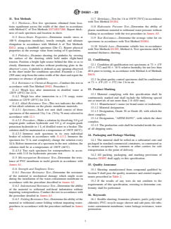 ABSTRACT This specification covers poly(vinyl chloride) flexible sheeting which is used without mastic, bedding, or coating for construction of concealed water containment membranes that include fountains, pools, planters, shower and safe pans, tile tubs, or similar wet installations where the membrane is inaccessible once the construction is complete. The plastic materials shall meet the inherent viscosity and compound density requirements and shall be subjected to tests that have been selected to be conducted primarily with liquids that simulate the environment to which the membrane will be subjected during actual use. Qualification tests shall be performed wherein the sheeting shall conform to the following physical property requirements: thickness; stress-strain properties such as tensile strength, tensile stress at elongation, and elongation at break; tear resistance; pinholes; microorganism resistance; puncture resistance; indentation resistance; folding resistance; chemical resistance to distilled water, soapy water, or alkali; hydrostatic pressure resistance; shrinkage; and volatile loss. SCOPE 1.1 This specification covers poly(vinyl chloride) (PVC) flexible sheeting which is used without mastic, bedding, or coating for construction of concealed water-containment-membranes in applications where there is potential for costly secondary damage from water leakage and very long-term reliable performance is essential. Examples are fountains, pools, planters, shower and safe pans, tile tubs, or similar wet installations where the membrane is inaccessible once the construction is complete. Included are requirements for materials and sheeting, test methods, workmanship criteria, and methods of marking. 1.2 Recycled materials may be used in this product in accordance with the requirements in Section 5. 1.3 The tests are intended to ensure quality and performance and are not intended for design purposes. Tests have been selected to be conducted primarily with liquids that simulate the environment to which the membrane will be subjected during actual use. 1.4 This specification does not cover water-containment membranes exposed to ultraviolet light. 1.5 The values stated in inch-pound units are to be regarded as the standard. The values given in parentheses are for information only. 1.6 There is no known ISO equivalent to this standard. 1.7 The following precautionary caveat pertains only to the test method portion, Section 11, of this specification: This standard does not purport to address all of the safety concerns, if any, associated with its use. It is the responsibility of the user of this standard to establish appropriate safety, health, and environmental practices and determine the applicability of regulatory limitations prior to use. 1.8 This international standard was developed in accordance with internationally recognized principles on standardization established in the Decision on Principles for the Development of International Standards, Guides and Recommendations issued by the World Trade Organization Technical Barriers to Trade (TBT) Committee.