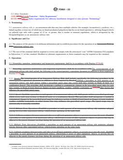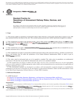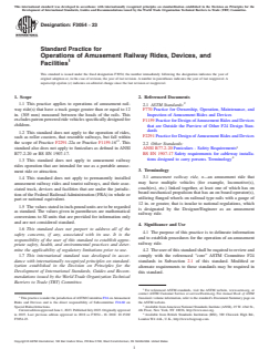 SIGNIFICANCE AND USE 4.1 The purpose of this practice is to delineate information and to establish procedures for the operation of an amusement railway ride. 4.2 The user of this standard shall be required to review and comply with the referenced “core” ASTM Committee F24 standards in Subsection 2.1 of this standard. Modified or alternate requirements to those standards may be required in this standard. SCOPE 1.1 This practice applies to operations of amusement railway ride(s) that have a track gauge greater than or equal to 12 in. (305 mm) measured between the heads of the rails. This excludes patron powered ride vehicles specifically designed for children. 1.2 This standard does not apply to the operation of rides, such as roller coasters, that resemble railways, but fall within the scope of Practice F2291-22a or Practice F1159-16ε1. This standard also does not apply to funiculars as defined in ANSI B77.2-20 or BS EN 1907-17. 1.3 This standard does not apply to amusement railway rides operation that are intended for use as a portable amusement ride or attraction. 1.4 This standard does not apply to permanently installed amusement railway rides and tourist railways, and their associated track, devices and facilities that are under the jurisdiction of the Federal Railroad Administration (FRA) in whole or part or national equivalent. 1.5 The values stated in inch-pound units are to be regarded as standard. The values given in parentheses are mathematical conversions to SI units that are provided for information only and are not considered standard. 1.6 This standard does not purport to address all of the safety concerns, if any, associated with its use. It is the responsibility of the user of this standard to establish appropriate safety, health, and environmental practices and determine the applicability of regulatory limitations prior to use. 1.7 This international standard was developed in accordance with internationally recognized principles on standardization established in the Decision on Principles for the Development of International Standards, Guides and Recommendations issued by the World Trade Organization Technical Barriers to Trade (TBT) Committee.