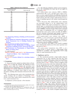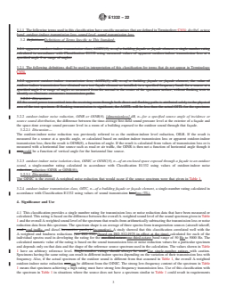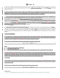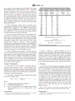 SIGNIFICANCE AND USE 4.1 This classification provides a single number rating for transmission loss or noise reduction data that have been measured or calculated. This rating is based on the difference between the overall A-weighted sound level of the sound spectrum given in Table 1 and the overall A-weighted sound level of the spectrum that results from arithmetically subtracting the transmission loss or noise reduction data from this spectrum. The spectrum shape is an average of three spectra from transportation sources (aircraft takeoff, road traffic, and diesel locomotive). A study showed that this classification correlated well with the A-weighted and loudness reductions (based on ISO 532:1975 in effect at the time) calculated for each of the individual spectra used in developing the rating for the one-third-octave band range of 50 Hz to 5000 Hz. The calculated numeric value of the rating is based on the sound transmission loss or noise reduction values for a particular specimen and depends only on that data and the shape of the reference source spectrum used in the calculation. The values shown in Table 1 have an arbitrary reference level. Use single-number ratings with caution. Specimens having the same rating can result in different indoor spectra depending on the variation of their transmission loss with frequency. Also, if the actual spectrum of the outdoor sound is different from that assumed in Table 1, the overall A-weighted outdoor-indoor noise reduction can be different from the OINIC. The strong low-frequency content of the spectrum in Table 1 means that specimen achieving a high rating must have strong low-frequency transmission loss. Use of this classification with the spectrum in Table 1 in situations where the source does not have a spectrum similar to Table 1 could result in requirements for more low-frequency transmission loss than is necessary for the application. Examples where this can occur are stage 3 jet aircraft, high-speed freeways with sound dominated by ti... SCOPE 1.1 The purpose of this classification is to provide a method to calculate single-number ratings that can be used for assessing the isolation from outdoor sound provided by a building or comparing building facade specimens including walls, doors, windows, and combinations thereof, including complete structures. These ratings are designed to correlate with subjective impressions of the ability of building elements to reduce the penetration of outdoor ground and air transportation noise that contains strong low-frequency sound.2 These ratings provide an evaluation and rank ordering of the performance of test specimens based on their effectiveness at controlling the sound of a specific outdoor sound spectrum called the reference source spectrum. 1.2 In addition to the calculation method, this classification provides the definition of the outdoor-indoor transmission class which is not defined elsewhere within ASTM standards. Other standards such as Guide E966 define additional ratings based on the method of this classification, one of which is discussed in this classification. 1.3 The rating does not necessarily relate to the perceived aesthetic quality of the transmitted sound. Different facade elements with similar ratings differ significantly in the proportion of low and high frequency sound that they transmit, and the spectra of sources can vary significantly. It is best to use specific sound transmission loss values, in conjunction with actual spectra of outdoor and indoor sound levels, for making final selections of facade elements. 1.4 Excluded from the scope of this classification are applications involving noise spectra differing markedly from that shown in Table 1. Thus excluded, for example, would be certain industrial noises with high levels at frequencies below the 80 Hz one-third octave band, relative to levels at higher frequencies, and any source, including some transportation sources, that does not ...