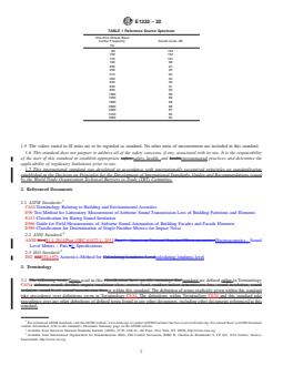 ASTM E1332-22 is a standard published by ASTM International. Its full title is "Standard Classification for Rating Outdoor-Indoor Sound Attenuation". This standard covers: SIGNIFICANCE AND USE 4.1 This classification provides a single number rating for transmission loss or noise reduction data that have been measured or calculated. This rating is based on the difference between the overall A-weighted sound level of the sound spectrum given in Table 1 and the overall A-weighted sound level of the spectrum that results from arithmetically subtracting the transmission loss or noise reduction data from this spectrum. The spectrum shape is an average of three spectra from transportation sources (aircraft takeoff, road traffic, and diesel locomotive). A study showed that this classification correlated well with the A-weighted and loudness reductions (based on ISO 532:1975 in effect at the time) calculated for each of the individual spectra used in developing the rating for the one-third-octave band range of 50 Hz to 5000 Hz. The calculated numeric value of the rating is based on the sound transmission loss or noise reduction values for a particular specimen and depends only on that data and the shape of the reference source spectrum used in the calculation. The values shown in Table 1 have an arbitrary reference level. Use single-number ratings with caution. Specimens having the same rating can result in different indoor spectra depending on the variation of their transmission loss with frequency. Also, if the actual spectrum of the outdoor sound is different from that assumed in Table 1, the overall A-weighted outdoor-indoor noise reduction can be different from the OINIC. The strong low-frequency content of the spectrum in Table 1 means that specimen achieving a high rating must have strong low-frequency transmission loss. Use of this classification with the spectrum in Table 1 in situations where the source does not have a spectrum similar to Table 1 could result in requirements for more low-frequency transmission loss than is necessary for the application. Examples where this can occur are stage 3 jet aircraft, high-speed freeways with sound dominated by ti... SCOPE 1.1 The purpose of this classification is to provide a method to calculate single-number ratings that can be used for assessing the isolation from outdoor sound provided by a building or comparing building facade specimens including walls, doors, windows, and combinations thereof, including complete structures. These ratings are designed to correlate with subjective impressions of the ability of building elements to reduce the penetration of outdoor ground and air transportation noise that contains strong low-frequency sound.2 These ratings provide an evaluation and rank ordering of the performance of test specimens based on their effectiveness at controlling the sound of a specific outdoor sound spectrum called the reference source spectrum. 1.2 In addition to the calculation method, this classification provides the definition of the outdoor-indoor transmission class which is not defined elsewhere within ASTM standards. Other standards such as Guide E966 define additional ratings based on the method of this classification, one of which is discussed in this classification. 1.3 The rating does not necessarily relate to the perceived aesthetic quality of the transmitted sound. Different facade elements with similar ratings differ significantly in the proportion of low and high frequency sound that they transmit, and the spectra of sources can vary significantly. It is best to use specific sound transmission loss values, in conjunction with actual spectra of outdoor and indoor sound levels, for making final selections of facade elements. 1.4 Excluded from the scope of this classification are applications involving noise spectra differing markedly from that shown in Table 1. Thus excluded, for example, would be certain industrial noises with high levels at frequencies below the 80 Hz one-third octave band, relative to levels at higher frequencies, and any source, including some transportation sources, that does not ...