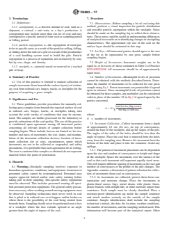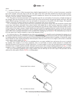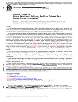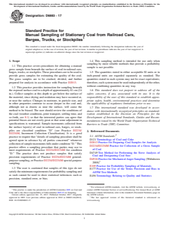 SIGNIFICANCE AND USE 5.1 These guidelines provide procedures for manually collecting gross samples from beneath the exposed surface of coal in railroad cars, barges, trucks, or stockpiles taking into account the wide variety of conditions that may be encountered. The samples are further processed for the laboratory to provide estimations of the coal quality. The use of this practice is conditional upon agreement among all interested parties concerning all relevant details of sample collection before sampling begins. These include, but are not limited to: lot size; number and mass of increments; the size, shape, and manipulation of the increment collection devices; location of increment collection site or sites; circumstances under which increments are not to be collected or suspended; and safety precautions. It is preferable that such agreements be in writing. The user is cautioned that samples so obtained do not represent material below the point of penetration. SCOPE 1.1 This practice covers procedures for obtaining a manual gross sample from beneath the surface of coal in railroad cars, barges, trucks, or stockpiles. These procedures are to be used to provide gross samples for estimating the quality of the coal. The gross samples are to be crushed, divided, and further prepared for analysis in accordance with Practice D2013. 1.2 This practice provides instruction for sampling beneath the exposed surface coal to a depth of approximately 61 cm (24 in.). Collect samples at this depth to get below the surface of the material, since drying and oxidation may have occurred at, or near the surface. Changes in moisture, in particle size, and in other properties continue to occur deeper in the coal and, although not as drastic as near the surface, will cause the method to be biased. The user should review the conditions of the coal (weather conditions, prior transport, settling time, and so forth, see 8.1) so that the interested parties can agree that potential biases are not overly great or that some adjustment in specifications is warranted. Sample increments collected from the surface layer(s) of coal in railroad cars, barges, or stockpiles are classified condition “D” (see Practice D2234/D2234M, Increment Collection Classification). It is a good practice to require that “details of sampling procedure shall be agreed upon in advance by all parties concerned” whenever collection of sample increments falls under condition “D.” This practice offers a sampling procedure that parties may use to meet requirements of Practice D2234/D2234M for condition “D.” The practice does not produce samples that satisfy precision requirements of Practice D2234/D2234M general-purpose sampling, or Practice D2234/D2234M special-purpose sampling. 1.3 The user is cautioned that samples of this type do not satisfy the minimum requirements for probability sampling and as such cannot be used to draw statistical inferences such as precision, standard error, or bias. 1.4 This sampling method is intended for use only when sampling by more reliable methods that provide a probability sample is not possible. 1.5 The quantities stated in either acceptable SI units or in inch-pound units are regarded separately as standard. The quantities stated in each system may not be exact equivalents; therefore, each system must be used independently of the other, without combining quantities in any way. 1.6 This standard does not purport to address all of the safety concerns, if any, associated with its use. It is the responsibility of the user of this standard to establish appropriate safety, health, environmental practices and determine the applicability of regulatory limitations prior to use. 1.7 This international standard was developed in accordance with internationally recognized principles on standardization established in the Decision on Principles for the Development of International Standards, Guides and Recommendations issued by the ...