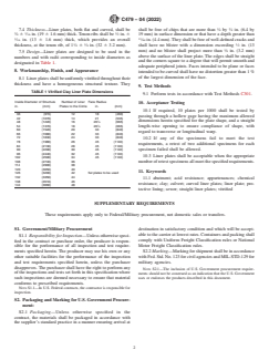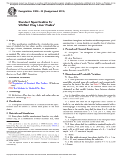 ASTM C479-04(2022) is a technical specification published by ASTM International. Its full title is "Standard Specification for Vitrified Clay Liner Plates". This standard covers: ABSTRACT This specification establishes the criteria for the acceptance of vitrified clay liner plates used to protectively line or face pipe, culverts, abutments, structures, or appurtenances. Linear plates manufactured shall be known as curved linear plates or flat liner plates. These plates shall be manufactured from fire clay, shale, surface clay, or a combination of these materials that, when formed into liner plates and fired to suitable temperatures, yield a product that is strong, durable, serviceable, and free of objectionable defects. The absorption of liner plates shall not exceed 6%. The liner plates shall be subjected to acid resistance test. These liner plates shall be uniformly vitrified throughout their thickness and have a homogeneous structural texture. SCOPE 1.1 This specification establishes the criteria for the acceptance of vitrified clay liner plates used to protectively line or face pipe, culverts, abutments, structures, or appurtenances. 1.2 The values stated in inch-pound units are to be regarded as standard. The values given in parentheses are mathematical conversions to SI units that are provided for information only and are not considered standard. 1.3 This international standard was developed in accordance with internationally recognized principles on standardization established in the Decision on Principles for the Development of International Standards, Guides and Recommendations issued by the World Trade Organization Technical Barriers to Trade (TBT) Committee.