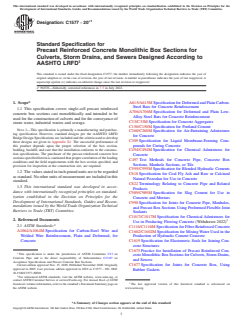 ASTM C1577-20e1 is a technical specification published by ASTM International. Its full title is "Standard Specification for Precast Reinforced Concrete Monolithic Box Sections for Culverts, Storm Drains, and Sewers Designed According to AASHTO LRFD". This standard covers: ABSTRACT This specification covers single-cell precast reinforced concrete box sections cast monolithically and intended to be used for the construction of culverts and for the conveyance of storm water, industrial wastes and sewage. The reinforced concrete shall consist of cementitious materials, mineral aggregates and water, in which steel has been embedded in such a manner that the steel and concrete act together. The precast reinforced concrete box sections shall be produced with tongue and groove ends. The box section shall be cured using any of the following methods or combinations thereof: steam curing; water curing; and membrane curing. Compression tests for determining concrete compressive strength shall be allowed to be made on either standard rodded concrete cylinders or concrete cylinders compacted and cured in like manner as the box sections, or on cores drilled from the box section. SCOPE 1.1 This specification covers single-cell precast reinforced concrete box sections cast monolithically and intended to be used for the construction of culverts and for the conveyance of storm water, industrial wastes and sewage. Note 1: This specification is primarily a manufacturing and purchasing specification. However, standard designs per the AASHTO LRFD Bridge Design Specifications are included and the criteria used to develop these designs are given in Appendix X1. The successful performance of this product depends upon the proper selection of the box section, bedding, backfill, and care that the installation conforms to the construction specifications. The purchaser of the precast reinforced concrete box sections specified herein is cautioned that proper correlation of the loading conditions and the field requirements with the box section specified, and provision for inspection at the construction site, are required. 1.2 The values stated in inch-pound units are to be regarded as standard. No other units of measurement are included in this standard. 1.3 This international standard was developed in accordance with internationally recognized principles on standardization established in the Decision on Principles for the Development of International Standards, Guides and Recommendations issued by the World Trade Organization Technical Barriers to Trade (TBT) Committee.