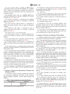 SIGNIFICANCE AND USE 4.1 This practice establishes the criteria to treat, or mark, or both WPM with permanent identification for the phytosanitary treatment, or intended service cycle, or both, repair, specification used, and other designated characteristics. 4.2 The marking of the WPM shall be performed after ensuring the material complies with the applicable specification. SCOPE 1.1 This practice covers the development of recommended treatment, or marking practices, or both, for wood packaging materials (WPM) and aids in identifying WPM as to phytosanitary treatment, intended service cycles, repair, the specific specification used to manufacture or recycle, and other user designated characteristics. 1.2 This practice identifies WPM treated, or marked, or both in accordance with industry, government, or international recognized standards. 1.3 The values stated in inch-pound units are to be regarded as standard. The values given in parentheses are mathematical conversions to SI units that are provided for information only and are not considered standard. 1.4 This standard does not purport to address all of the safety concerns, if any, associated with its use. It is the responsibility of the user of this standard to establish appropriate safety, health, and environmental practices and determine the applicability of regulatory limitations prior to use. 1.5 This international standard was developed in accordance with internationally recognized principles on standardization established in the Decision on Principles for the Development of International Standards, Guides and Recommendations issued by the World Trade Organization Technical Barriers to Trade (TBT) Committee.