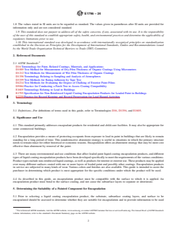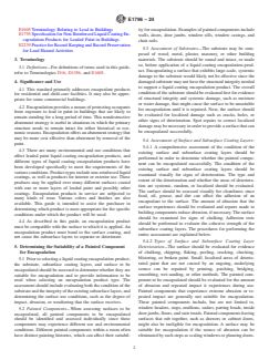 SIGNIFICANCE AND USE 4.1 This standard primarily addresses encapsulant products for residential and child-care facilities. It may also be appropriate for some commercial buildings. 4.2 Encapsulation provides a means of protecting occupants from exposure to lead in paint in buildings that are likely to remain standing for a long period of time. This nondestructive abatement strategy is useful in situations in which the primary structure needs to remain intact for either historical or economic reasons. Encapsulation offers an abatement strategy that may be more cost effective than abatement by removal of the paint. 4.3 There are many environmental and use conditions that affect leaded paint liquid coating encapsulation products, and different types of liquid coating encapsulation products have been developed specifically to meet the requirements of the various conditions. Product types include non-reinforced liquid coatings, as well as products for interior or exterior use. These products may be applied over many different surfaces coated with one or more layers of leaded paint and possibly other coatings. Encapsulation products in service are subjected to many kinds of wear. Various colors and finishes are also available. This guide is intended to assist the purchaser in determining which product is most appropriate for the specific conditions under which the product will be used. 4.4 As described in this guide, an encapsulation product must be compatible with the surface to which it is applied. An encapsulation product must bond to the surface coating, and not cause the subsurface layers to separate or deteriorate. SCOPE 1.1 This guide is intended to provide building users such as private building owners, contractors, architects, homeowners, and regulatory authorities with assistance in selecting an appropriate liquid coating encapsulation product for architectural residence and child-care facility use situations for abating leaded paint. This guide also provides information that can be used to assist in the following: (1) determining whether a painted surface is suitable for encapsulation, (2) applying a liquid coating encapsulation product, (3) evaluating installed liquid coating encapsulation products, and (4) maintaining the encapsulated surface. 1.2 This guide applies to any liquid-applied product that relies primarily on adhesion for attachment to the surface and is designed to reduce human exposure to lead in paint. 1.3 This guide is not intended for use as a training manual. The information contained herein is not all-inclusive and does not provide comprehensive instructions for the selection, application, or maintenance of specific liquid coating encapsulation products. This guide is intended to supplement information supplied by encapsulation product manufacturers and safety requirements established by law. The user of this guide shall refer to the encapsulation product manufacturer’s instructions for encapsulation product application and maintenance. 1.4 This guide does not cover minimum material performance requirements for liquid coating encapsulation products. Performance specifications for non-reinforced liquid coating encapsulation products are provided in Specification E1795. 1.5 Encapsulation products for use on industrial steel structures are not covered in this guide. Industrial steel structures include, but are not limited to, bridges, water towers, and tanks. 1.6 Limited documentation is available on evaluating the field performance of liquid coating encapsulation products. A conservative approach to assessing the selection and use of liquid coating encapsulation products is thus adopted in this guide. As appropriate, the guidance provided within will be revised as additional knowledge regarding how these products perform over time is gained. 1.7 The user of this guide should follow all regulations promulgated by authorities having jurisdiction regarding the use o...
