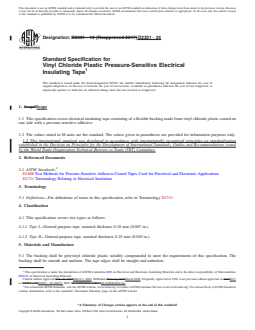ABSTRACT This specification covers electrical insulating tape consisting of a flexible backing made from vinyl chloride plastic coated on one side with a pressure-sensitive adhesive. The tape shall be classified according to thickness: Type I and Type II. The backing shall be polyvinyl chloride plastic suitably compounded to meet the requirements of this specification. The backing shall be smooth and uniform. The selection of rolls, conditioning, and testing shall be in accordance with the specified requirements. SCOPE 1.1 This specification covers electrical insulating tape consisting of a flexible backing made from vinyl chloride plastic coated on one side with a pressure-sensitive adhesive. 1.2 The values stated in SI units are the standard. The values given in parentheses are provided for information purposes only. 1.3 This international standard was developed in accordance with internationally recognized principles on standardization established in the Decision on Principles for the Development of International Standards, Guides and Recommendations issued by the World Trade Organization Technical Barriers to Trade (TBT) Committee.