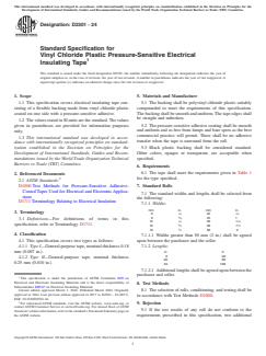ASTM D2301-24 is a technical specification published by ASTM International. Its full title is "Standard Specification for Vinyl Chloride Plastic Pressure-Sensitive Electrical Insulating Tape". This standard covers: ABSTRACT This specification covers electrical insulating tape consisting of a flexible backing made from vinyl chloride plastic coated on one side with a pressure-sensitive adhesive. The tape shall be classified according to thickness: Type I and Type II. The backing shall be polyvinyl chloride plastic suitably compounded to meet the requirements of this specification. The backing shall be smooth and uniform. The selection of rolls, conditioning, and testing shall be in accordance with the specified requirements. SCOPE 1.1 This specification covers electrical insulating tape consisting of a flexible backing made from vinyl chloride plastic coated on one side with a pressure-sensitive adhesive. 1.2 The values stated in SI units are the standard. The values given in parentheses are provided for information purposes only. 1.3 This international standard was developed in accordance with internationally recognized principles on standardization established in the Decision on Principles for the Development of International Standards, Guides and Recommendations issued by the World Trade Organization Technical Barriers to Trade (TBT) Committee.