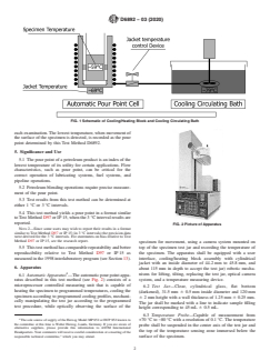 SIGNIFICANCE AND USE 5.1 The pour point of a petroleum product is an index of the lowest temperature of its utility for certain applications. Flow characteristics, such as pour point, can be critical for the correct operation of lubricating systems, fuel systems, and pipeline operations. FIG. 1 Schematic of Cooling/Heating Block and Cooling Circulating Bath 5.2 Petroleum blending operations require precise measurement of the pour point. 5.3 Test results from this test method can be determined at either 1 °C or 3 °C intervals. 5.4 This test method yields a pour point in a format similar to Test Method D97 or IP 15, when the 3 °C interval results are reported. Note 2: Since some users may wish to report their results in a format similar to Test Method D97 or IP 15 (in 3 °C intervals) the precision data were derived for the 3 °C intervals. For statements on bias relative to Test Method D97 or IP 15, see the research report. 5.5 This test method has comparable repeatability and better reproducibility relative to Test Method D97 or IP 15 as measured in the 1998 interlaboratory program (see Section 13). SCOPE 1.1 This test method covers the determination of the pour point of petroleum products by an automatic instrument that tilts the test jar to detect movement of the surface of the test specimen with an optical device, after being removed from a regulated, stepped-bath cooling jacket. 1.2 This test method is designed to cover the range of temperatures from −57 °C to +51 °C; however, the range of temperatures included in the 1998 interlaboratory test program only covered the temperature range from −51 °C to −11 °C. 1.3 Test results from this test method can be determined at either 1 °C or 3 °C testing intervals. 1.4 This test method is not intended for use with crude oils. Note 1: The applicability of this test method on residual fuel samples has not been verified. For further information on the applicability, refer to 13.4. 1.5 The values stated in SI units are to be regarded as standard. No other units of measurement are included in this standard. 1.6 This standard does not purport to address all of the safety concerns, if any, associated with its use. It is the responsibility of the user of this standard to establish appropriate safety, health, and environmental practices and determine the applicability of regulatory limitations prior to use. 1.7 This international standard was developed in accordance with internationally recognized principles on standardization established in the Decision on Principles for the Development of International Standards, Guides and Recommendations issued by the World Trade Organization Technical Barriers to Trade (TBT) Committee.
