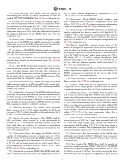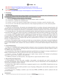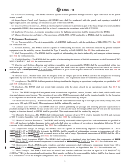 ABSTRACT This specification covers engineering and design criteria for rigid wall relocatable structures (RWRSs) which shall be used for designing expandable and nonexpendable RWRSs. RWRSs shall be manufactured from recovered materials, wherein intimate contact of dissimilar materials shall not be allowed (to prevent galvanic corrosion), all components shall be adequately protected from corrosion, and the materials used shall not cause any skin irritation or injury to the person handling the material during transportation, operation, or maintenance of the equipment. Tests for compatibility, air transportability, ground mobility, rail transportability, forklift handling, erecting and striking, air tightness, blackout, humidity resistance, marine atmosphere, temperature, solar load, temperature shock, heat transfer, blowing sand, sunshine (ultraviolet effects), flame resistance, fungus resistance, squareness, panel flatness, roof loads, floor loads, door loads, panel attachment points, leveling devices, lifting and towing provision strength, tow and dragging simulator, flat and rotational drop (with or without skids), drop shock, impact resistance, electromagnetic interference provisions, water tightness, and lift shall be performed and shall conform to the requirements specified. SCOPE 1.1 This specification covers engineering and design criteria required for the development of rigid wall relocatable structures (RWRS) and shall be applied to the design of expandable and nonexpandable RWRSs. This specification applies to present engineering and design requirements for effective RWRSs that are operable in a variety of environments without degradation and are capable of all specified transport modes. This specification shall be applied to the design of expandable and nonexpandable RWRSs. This specification is a conversion of a military standard that was approved by all departments and agencies of the Department of Defense. 1.2 The values stated in inch-pound units are to be regarded as standard. The values given in parentheses are mathematical conversions to SI units that are provided for information only and are not considered standard. 1.3 The following safety hazards caveat pertains only to the test required portion, Section 10, of this specification. This specification does not purport to address all of the safety concerns, if any, associated with its use. It is the responsibility of the user of this specification to establish appropriate safety, health, and environmental practices and determine the applicability of regulatory limitations prior to use. 1.4 This international standard was developed in accordance with internationally recognized principles on standardization established in the Decision on Principles for the Development of International Standards, Guides and Recommendations issued by the World Trade Organization Technical Barriers to Trade (TBT) Committee.