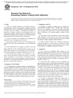 SIGNIFICANCE AND USE 3.1 Holidays in pipeline coatings may be repaired by circumferential wrapping with a suitable pipe wrap tape. However, this technique is not always practicable and patching may be required. The effectiveness of a patch material depends upon its adhesion to the original pipeline coating to effect sealing. 3.2 The results of this accelerated test have been found to yield comparative data useful for the selection of patching materials. The user is cautioned against the use of this method for absolute material properties characterization. 3.3 This procedure provides an accelerated method by exposing the patch to a severe radius of curvature on small-diameter pipe. The specimen is also exposed to a stress voltage in the presence of a highly conductive electrolyte. SCOPE 1.1 This test method provides an accelerated means of determining the relative sealing abilities of pipeline patching materials that are used to seal holidays in pipeline coatings on steel pipe. This test method is intended for utilization of specimens of pipeline coatings on small-diameter pipe, for representing coatings used for buried or submerged service, and where the purpose of the coating is to provide an electrical barrier between the steel pipe and its environment. 1.2 This test method is not intended for evaluating patch materials that are overlapped upon themselves. 1.3 The values stated in SI units are to be regarded as the standard. The values given in parentheses are for information only. 1.4 This standard does not purport to address all of the safety concerns, if any, associated with its use. It is the responsibility of the user of this standard to establish appropriate safety, health, and environmental practices and determine the applicability of regulatory limitations prior to use. 1.5 This international standard was developed in accordance with internationally recognized principles on standardization established in the Decision on Principles for the Development of International Standards, Guides and Recommendations issued by the World Trade Organization Technical Barriers to Trade (TBT) Committee.