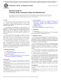 SIGNIFICANCE AND USE 4.1 The design and configuration of an audio laboratory, as well as the maintenance of equipment, are factors that must be considered to ensure an optimal environment to produce the best results. This guide is intended to provide general guidance for laboratory setup and maintenance. 4.2 This document is not meant to be an all-inclusive guide on how to set up a laboratory; nor does it contain information pertaining to specific commercial products as it relates to computer hardware, forensic, and non-forensic software applications. 4.3 When dealing with equipment and technology outside your area of expertise, consult with an appropriate specialist. SCOPE 1.1 This guide sets forth recommendations for the creation of a forensic audio laboratory space as well as the configuration, verification, and maintenance of the equipment contained within the lab. 1.2 In designing and configuring an audio laboratory, it is important to consider the acoustical environment/room of the laboratory, as well as climate control. Other than having a viable location for the laboratory, computer hardware and software applications are the most important components of a laboratory. 1.3 This standard does not purport to address all of the safety concerns, if any, associated with its use. It is the responsibility of the user of this standard to establish appropriate safety, health, and environmental practices and determine the applicability of regulatory limitations prior to use. 1.4 This international standard was developed in accordance with internationally recognized principles on standardization established in the Decision on Principles for the Development of International Standards, Guides and Recommendations issued by the World Trade Organization Technical Barriers to Trade (TBT) Committee.