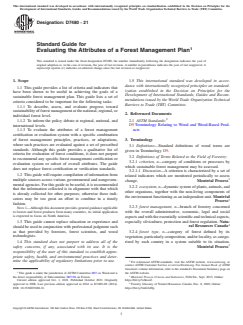 ASTM D7480-21 is a guide published by ASTM International. Its full title is "Standard Guide for Evaluating the Attributes of a Forest Management Plan". This standard covers: SIGNIFICANCE AND USE 5.1 This guide is intended to be used by developers of standards and other documents in the field of renewable resources and green building to evaluate whether the attributes of a specific forest management system meet the intent of sustainable forest management. 5.2 In addition to the attributes addressed by this document, some users may wish to impose other evaluation criteria intended to satisfy goals beyond maintaining sustained-yield and sustainable forest management. While these issues are not specifically addressed in this guide, some are discussed in Appendix X1, Commentary. SCOPE 1.1 This guide provides a list of criteria and indicators that have been shown to be useful in achieving the goals of a sustainable forest management plan. This guide lists a set of criteria considered to be important for the following tasks: 1.1.1 To describe, assess, and evaluate progress toward sustainability of forest management at the national, regional, or individual forest level. 1.1.2 To inform the policy debate at regional, national, and international levels. 1.1.3 To evaluate the attributes of a forest management certification or evaluation system with a specific combination of forest management principles, practices, or adaptations, where such practices are evaluated against a set of prescribed standards. Although this guide provides a qualitative list of criteria for evaluation of forest conditions, it does not purport to recommend any specific forest management certification or evaluation system or subset of overall attributes. The guide does not replace forest certification or verification standards. 1.2 This guide will require compilation of information from multiple sources across various governmental and nongovernmental agencies. For this guide to be useful, it is recommended that the information collected is in alignment with that which is already collected for other purposes; otherwise these indicators may be too great an effort to combine in a timely fashion. Note 1: Although this document provides general guidance applicable to forests and forest products from many countries, its initial application is expected to focus on North America. 1.3 This guide cannot replace education or experience and should be used in conjunction with professional judgment such as that provided by foresters, forest scientists, and wood technologists. 1.4 This standard does not purport to address all of the safety concerns, if any, associated with its use. It is the responsibility of the user of this standard to establish appropriate safety, health, and environmental practices and determine the applicability of regulatory limitations prior to use. 1.5 This international standard was developed in accordance with internationally recognized principles on standardization established in the Decision on Principles for the Development of International Standards, Guides and Recommendations issued by the World Trade Organization Technical Barriers to Trade (TBT) Committee.