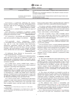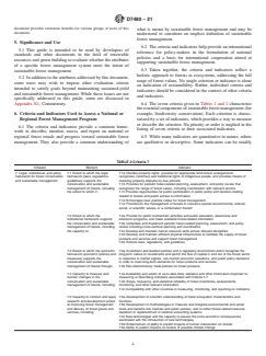 SIGNIFICANCE AND USE 5.1 This guide is intended to be used by developers of standards and other documents in the field of renewable resources and green building to evaluate whether the attributes of a specific forest management system meet the intent of sustainable forest management. 5.2 In addition to the attributes addressed by this document, some users may wish to impose other evaluation criteria intended to satisfy goals beyond maintaining sustained-yield and sustainable forest management. While these issues are not specifically addressed in this guide, some are discussed in Appendix X1, Commentary. SCOPE 1.1 This guide provides a list of criteria and indicators that have been shown to be useful in achieving the goals of a sustainable forest management plan. This guide lists a set of criteria considered to be important for the following tasks: 1.1.1 To describe, assess, and evaluate progress toward sustainability of forest management at the national, regional, or individual forest level. 1.1.2 To inform the policy debate at regional, national, and international levels. 1.1.3 To evaluate the attributes of a forest management certification or evaluation system with a specific combination of forest management principles, practices, or adaptations, where such practices are evaluated against a set of prescribed standards. Although this guide provides a qualitative list of criteria for evaluation of forest conditions, it does not purport to recommend any specific forest management certification or evaluation system or subset of overall attributes. The guide does not replace forest certification or verification standards. 1.2 This guide will require compilation of information from multiple sources across various governmental and nongovernmental agencies. For this guide to be useful, it is recommended that the information collected is in alignment with that which is already collected for other purposes; otherwise these indicators may be too great an effort to combine in a timely fashion. Note 1: Although this document provides general guidance applicable to forests and forest products from many countries, its initial application is expected to focus on North America. 1.3 This guide cannot replace education or experience and should be used in conjunction with professional judgment such as that provided by foresters, forest scientists, and wood technologists. 1.4 This standard does not purport to address all of the safety concerns, if any, associated with its use. It is the responsibility of the user of this standard to establish appropriate safety, health, and environmental practices and determine the applicability of regulatory limitations prior to use. 1.5 This international standard was developed in accordance with internationally recognized principles on standardization established in the Decision on Principles for the Development of International Standards, Guides and Recommendations issued by the World Trade Organization Technical Barriers to Trade (TBT) Committee.