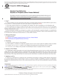 SIGNIFICANCE AND USE 5.1 This test is a functional test in which the water concentration in the product is related to product behavior characteristics in a pressure-reducing system of special design to arrive at a measure of product acceptability in common use applications. Experience has demonstrated that excessive water content (dissolved water) will cause freeze-up difficulties in pressure reducing systems. SCOPE 1.1 This test method covers the measurement of the dryness of propane products that do not contain antifreeze agents such as, but not limited to, commercial propane and special duty propane (see Specification D1835). 1.2 The values stated in SI units are to be regarded as the standard. The values in parentheses are for information only. 1.3 This standard does not purport to address all of the safety concerns, if any, associated with its use. It is the responsibility of the user of this standard to establish appropriate safety, health, and environmental practices and determine the applicability of regulatory limitations prior to use. 1.4 This international standard was developed in accordance with internationally recognized principles on standardization established in the Decision on Principles for the Development of International Standards, Guides and Recommendations issued by the World Trade Organization Technical Barriers to Trade (TBT) Committee.