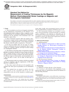 SIGNIFICANCE AND USE 5.1 The thickness of a coating is often critical to its performance. This magnetic method is suitable for measuring nondestructively the thickness of some nickel coatings and for specification acceptance. 5.2 This method requires that the magnetic properties of the coating and its substrate be the same as those of the reference standards used for the calibration adjustment of the instrument. 5.3 This method should not be used to determine the thickness of autocatalytically deposited nickel-phosphorus alloys containing more than 8 % phosphorus on steel. Those coatings are sufficiently nonmagnetic for Test Method B499 to be suitable for that determination, as long as the measurement is made prior to any heat treatment. SCOPE 1.1 This test method covers the use of magnetic instruments for the nondestructive measurement of the thickness of an electrodeposited nickel coating on either a magnetic or nonmagnetic substrate. It is intended to supplement manufacturers’ instructions for the operation of the instruments and is not intended to replace them. 1.2 These instruments measure either the magnetic attraction between a magnet and the coating-substrate combination (categorized as “magnetic pull-off”), or the change in magnetic flux density within the probe (categorized as “electronic”). 1.3 For this test method, there are two types of coating-substrate combinations that can be encountered: Type A, nickel coatings on a magnetic substrate, and Type B, nickel coatings on a nonmagnetic substrate. 1.4 The effective measuring ranges of instruments using the principle of magnetic attraction are up to 50 μm (2 mils) for Type A coatings, and up to 25 μm (1 mil) for Type B coatings. For gages based on change in magnetic flux density principles, the effective ranges are much greater, and measurements up to 1 mm (40 mils) or more, can be made on both types of coatings. 1.5 Measurements made in accordance with this test method will be in compliance with the requirements of ISO Standard 2361 as printed in 1982. 1.6 The values stated in SI units are to be regarded as the standard. The values given in parentheses are for information only. 1.7 This standard does not purport to address all of the safety concerns, if any, associated with its use. It is the responsibility of the user of this standard to establish appropriate safety, health, and environmental practices and determine the applicability of regulatory limitations prior to use. 1.8 This international standard was developed in accordance with internationally recognized principles on standardization established in the Decision on Principles for the Development of International Standards, Guides and Recommendations issued by the World Trade Organization Technical Barriers to Trade (TBT) Committee.