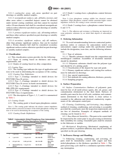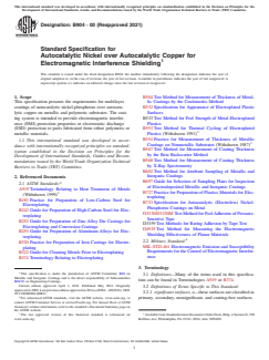 ASTM B904-00(2021) is a technical specification published by ASTM International. Its full title is "Standard Specification for Autocatalytic Nickel over Autocatalytic Copper for Electromagnetic Interference Shielding". This standard covers: ABSTRACT This specification covers the requirements for multilayer coatings of autocatalytic nickel-phosphorus over autocatalytic copper intended for electromagnetic interference or electrostatic discharge shielding to parts fabricated from either polymeric or metallic substrates or parts. Coatings are classified into four types based on thickness and testing requirements, and into two grades based on alloy composition, specifically phosphorus. Surfaces shall be prepared by cleaning it of surface contaminants, conditioning, and activation; identifying of base material suitability; and mechanical roughening. Coatings shouldl be inspected for process qualification, appearance, blisters, unplated areas, adhesion, electrical continuity, and DC resistance. Coatings should also be tested for thickness, which may be performed either by Coulometric, X-ray, or Beta backscatter methods. The requirements for process qualification shall include coating composition, electrical integrity, adhesion, thermal shock resistance, thermal cycling, and shielding effectiveness. SCOPE 1.1 This international standard was developed in accordance with internationally recognized principles on standardization established in the Decision on Principles for the Development of International Standards, Guides and Recommendations issued by the World Trade Organization Technical Barriers to Trade (TBT) Committee.