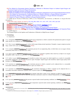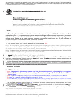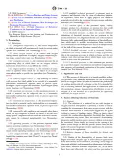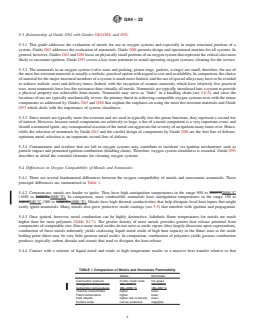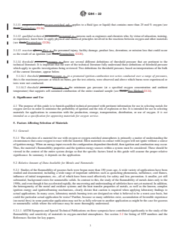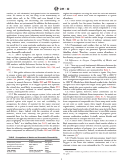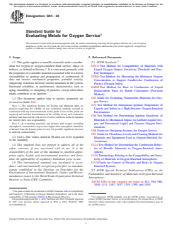 SIGNIFICANCE AND USE 4.1 The purpose of this guide is to furnish qualified technical personnel with pertinent information for use in selecting metals for oxygen service in order to minimize the probability of ignition and the risk of explosion or fire. It is intended for use in selecting materials for applications in connection with the production, storage, transportation, distribution, or use of oxygen. It is not intended as a specification for approving materials for oxygen service. SCOPE 1.1 This guide applies to metallic materials under consideration for oxygen or oxygen-enriched fluid service, direct or indirect, as defined in Section 3. It is concerned primarily with the properties of a metallic material associated with its relative susceptibility to ignition and propagation of combustion. It does not involve mechanical properties, potential toxicity, outgassing, reactions between various materials in the system, functional reliability, or performance characteristics such as aging, shredding, or sloughing of particles, except when these might contribute to an ignition. 1.2 This document applies only to metals; nonmetals are covered in Guide G63. Note 1: The American Society for Testing and Materials takes no position respecting the validity of any evaluation methods asserted in connection with any item mentioned in this guide. Users of this guide are expressly advised that determination of the validity of any such evaluation methods and data and the risk of use of such evaluation methods and data are entirely their own responsibility. Note 2: In evaluating materials, any mixture with oxygen exceeding atmospheric concentration at pressures higher than atmospheric should be evaluated from the hazard point of view for possible significant increase in material combustibility. 1.3 Units—The values stated in SI units are to be regarded as the standard. 1.4 This standard does not purport to address all of the safety concerns, if any, associated with its use. It is the responsibility of the user of this standard to establish appropriate safety, health, and environmental practices and determine the applicability of regulatory limitations prior to use. 1.5 This international standard was developed in accordance with internationally recognized principles on standardization established in the Decision on Principles for the Development of International Standards, Guides and Recommendations issued by the World Trade Organization Technical Barriers to Trade (TBT) Committee.
