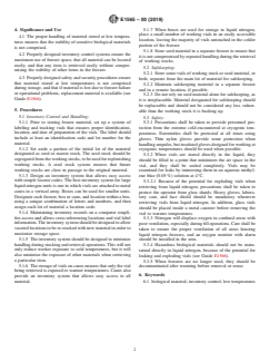 SIGNIFICANCE AND USE 4.1 The proper handling of material stored at low temperatures ensures that the stability of sensitive biological materials is not comprised. 4.2 Properly designed inventory control systems ensure the maximum use of freezer space, that all material can be located easily, and that any item is retrieved easily without compromising the stability of other items in the freezer. 4.3 Properly designed safety and security procedures ensure that material stored at low temperatures is not comprised during storage, and that if material is lost due to freezer failure or operational problems, replacement material is available (see Guide E1566). SCOPE 1.1 This guide covers recommended procedures for handling material stored at low temperatures in mechanical freezers and liquid nitrogen freezers. 1.2 This guide covers recommendations for implementing procedures for ensuring adequate inventory control. 1.3 This guide covers recommendations for implementing procedures for safeguarding material stored at low temperatures. 1.4 This guide does not cover the development or maintenance of equipment and facilities for low-temperature storage which are covered in Guide E1564. 1.5 This guide does not cover practices for preservation by freezing which are covered in Practice E1342. 1.6 The values stated in SI units are to be regarded as standard. No other units of measurement are included in this standard. 1.7 This standard does not purport to address all of the safety concerns, if any, associated with its use. It is the responsibility of the user of this standard to establish appropriate safety, health, and environmental practices and determine the applicability of regulatory limitations prior to use. 1.8 This international standard was developed in accordance with internationally recognized principles on standardization established in the Decision on Principles for the Development of International Standards, Guides and Recommendations issued by the World Trade Organization Technical Barriers to Trade (TBT) Committee.