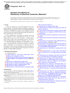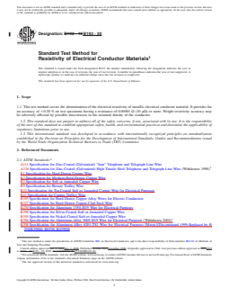 ABSTRACT This test method covers the determination of the electrical resistivity of metallic electrical conductor material. Weight resistivity accuracy may be adversely affected by possible inaccuracies in the assumed density of the conductor. The definition of resistivity and the equations for calculating volume resistivity and weight resistivity are given. Resistance shall be measured using an apparatus with a circuit configuration and instrumentation that has a resistance measurement capability of the prescribed accuracy. The test specimen requirements and the test procedure including: (1) determination of dimensions (such as length and cross-section), weight, and density, and (2) resistance measurement are detailed. The formula for calculating the corrected resistance, when the measurement is made at any temperature other than a reference temperature, is given. No statement of precision has been made and no work has been planned to develop such a statement. This test method has no bias because the value for resistivity is determined solely in terms of this test method. SCOPE 1.1 This test method covers the determination of the electrical resistivity of metallic electrical conductor material. It provides for an accuracy of ±0.30 % on test specimens having a resistance of 0.00001 Ω (10 μΩ) or more. Weight resistivity accuracy may be adversely affected by possible inaccuracies in the assumed density of the conductor. 1.2 This standard does not purport to address all of the safety concerns, if any, associated with its use. It is the responsibility of the user of this standard to establish appropriate safety, health, and environmental practices and determine the applicability of regulatory limitations prior to use. 1.3 This international standard was developed in accordance with internationally recognized principles on standardization established in the Decision on Principles for the Development of International Standards, Guides and Recommendations issued by the World Trade Organization Technical Barriers to Trade (TBT) Committee.