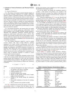 SIGNIFICANCE AND USE 4.1 In neutron dosimetry, a fission or non-fission dosimeter, or combination of dosimeters, can be used for determining a fluence rate, fluence, or neutron spectrum in nuclear reactors. Each dosimeter is sensitive to a specific energy range, and, if desired, increased accuracy in a fluence-rate spectrum can be achieved by the use of several dosimeters each covering specific neutron energy ranges. 4.2 A wide variety of detector materials is used for various purposes. Many of these substances overlap in the energy of the neutrons which they will detect, but many different materials are used for a variety of reasons. These reasons include available analysis equipment, different cross sections for different fluence-rate levels and spectra, preferred chemical or physical properties, and, in the case of radiometric dosimeters, varying requirements for different half-life isotopes, possible interfering activities, and chemical separation requirements. SCOPE 1.1 This guide covers the selection, design, irradiation, post-irradiation handling, and quality control of neutron dosimeters (sensors), thermal neutron shields, and capsules for reactor surveillance neutron dosimetry. 1.2 The values stated in SI units are to be regarded as standard. Values in parentheses are for information only. 1.3 This standard does not purport to address all of the safety concerns, if any, associated with its use. It is the responsibility of the user of this standard to establish appropriate safety, health, and environmental practices and determine the applicability of regulatory limitations prior to use. 1.4 This international standard was developed in accordance with internationally recognized principles on standardization established in the Decision on Principles for the Development of International Standards, Guides and Recommendations issued by the World Trade Organization Technical Barriers to Trade (TBT) Committee.